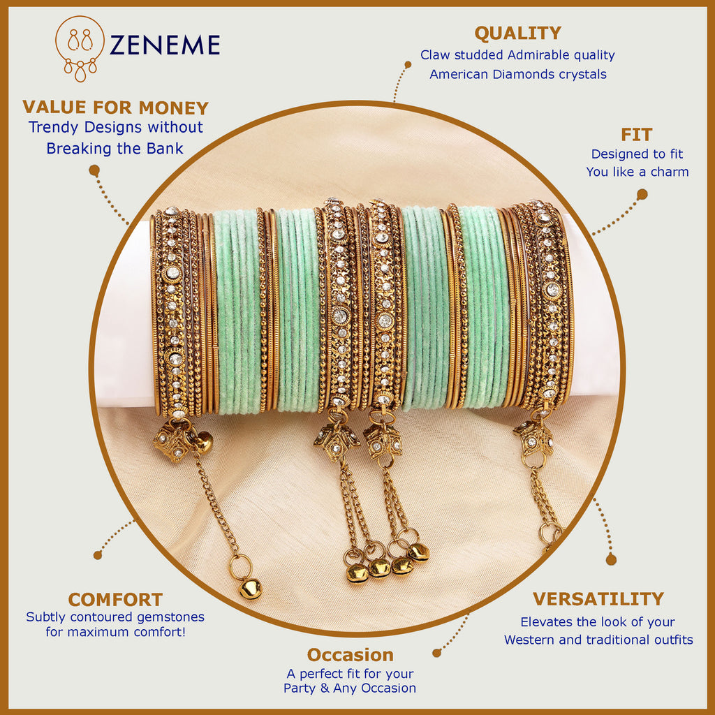 Elegant Design: Elegant bangle set featuring sea green silk thread work, gold-tone metal accents, and stone-studded bangles. Finished with delicate dangling charms, this set blends tradition with a modern pastel touch