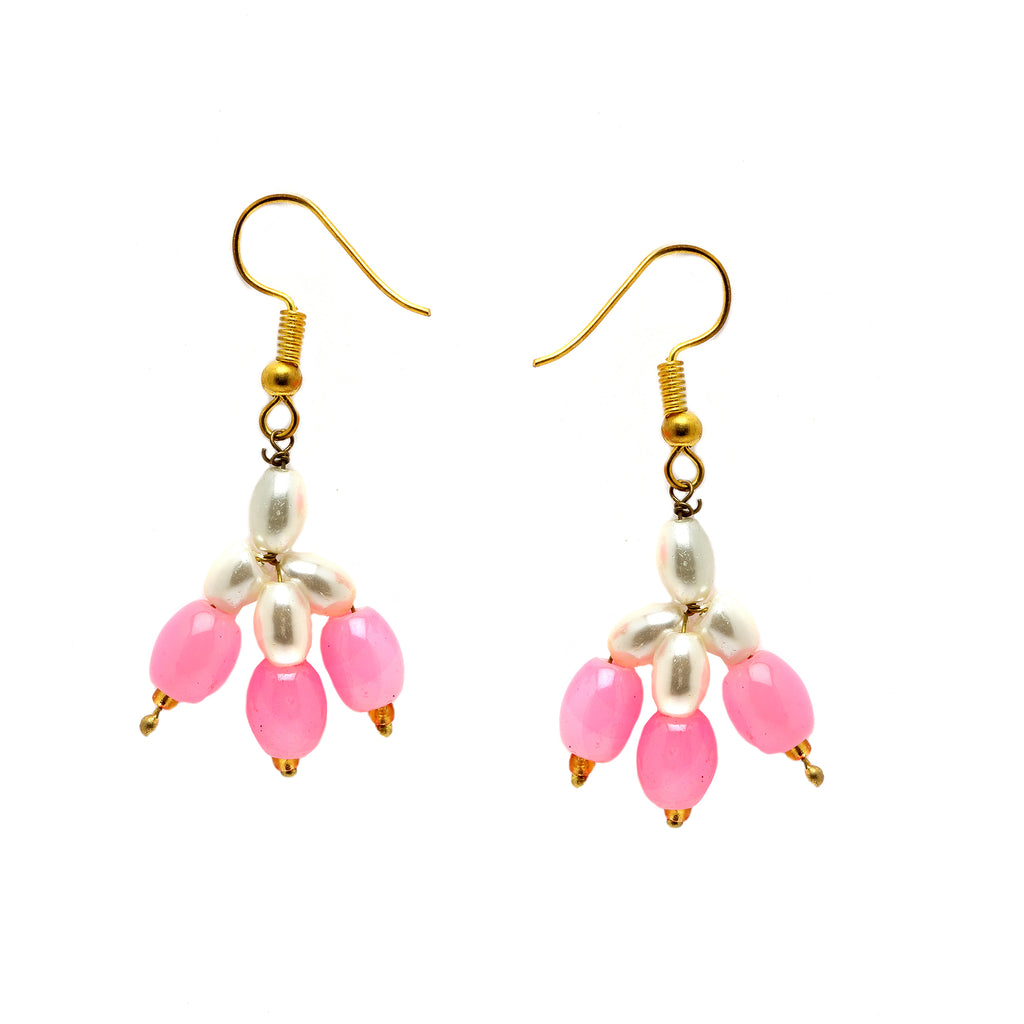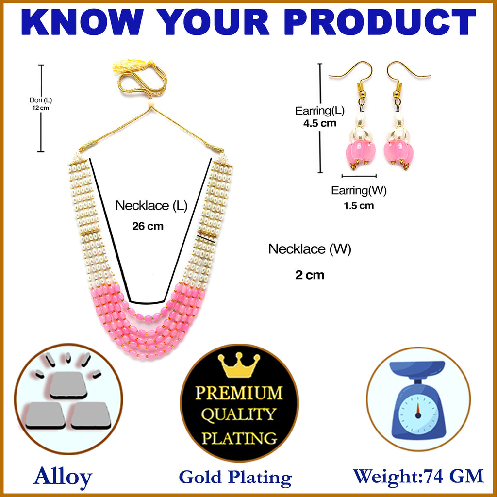 This jewellery set consists of a necklace and a pair of earrings. Gold-Plated White and Pink Pearl Beaded Layered necklace, secured with a Drawstring closure. A pair of matching drop earrings, each secured with Fish Wire Hook closure.