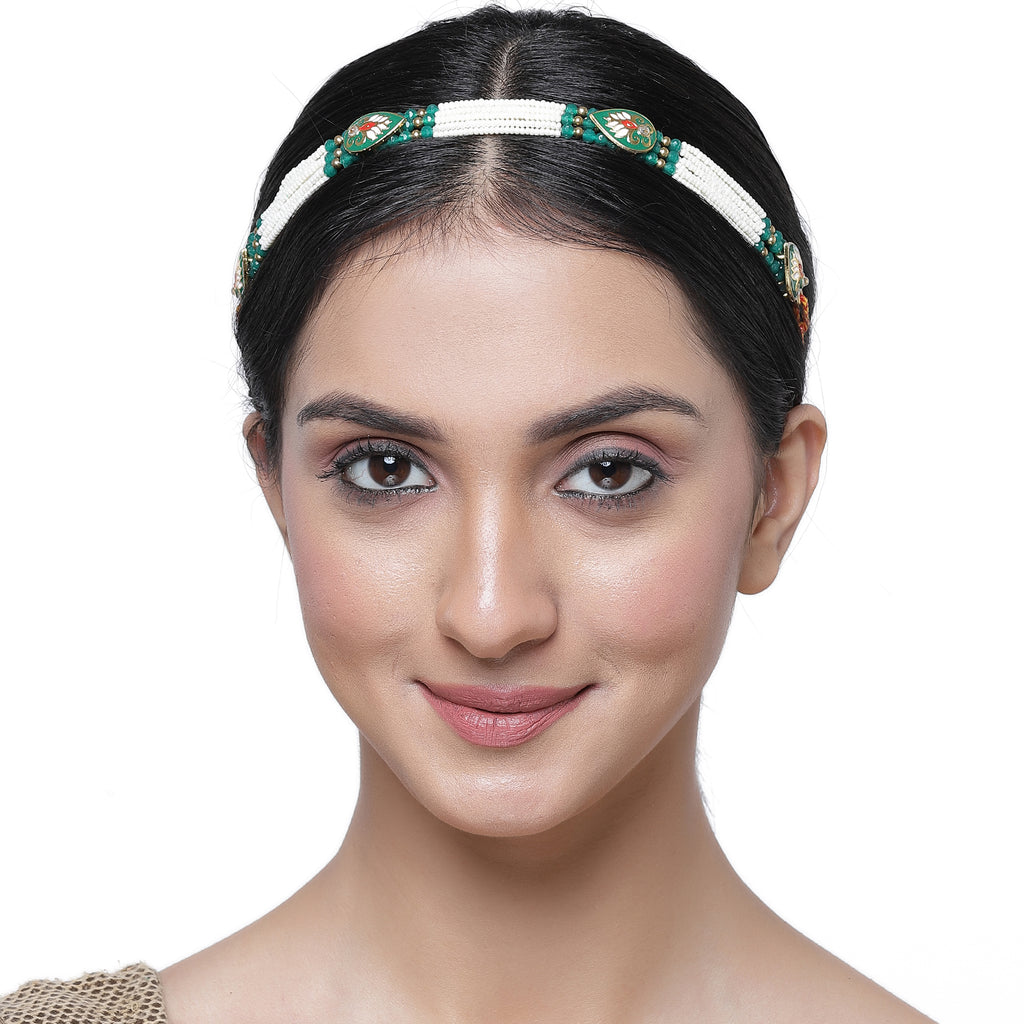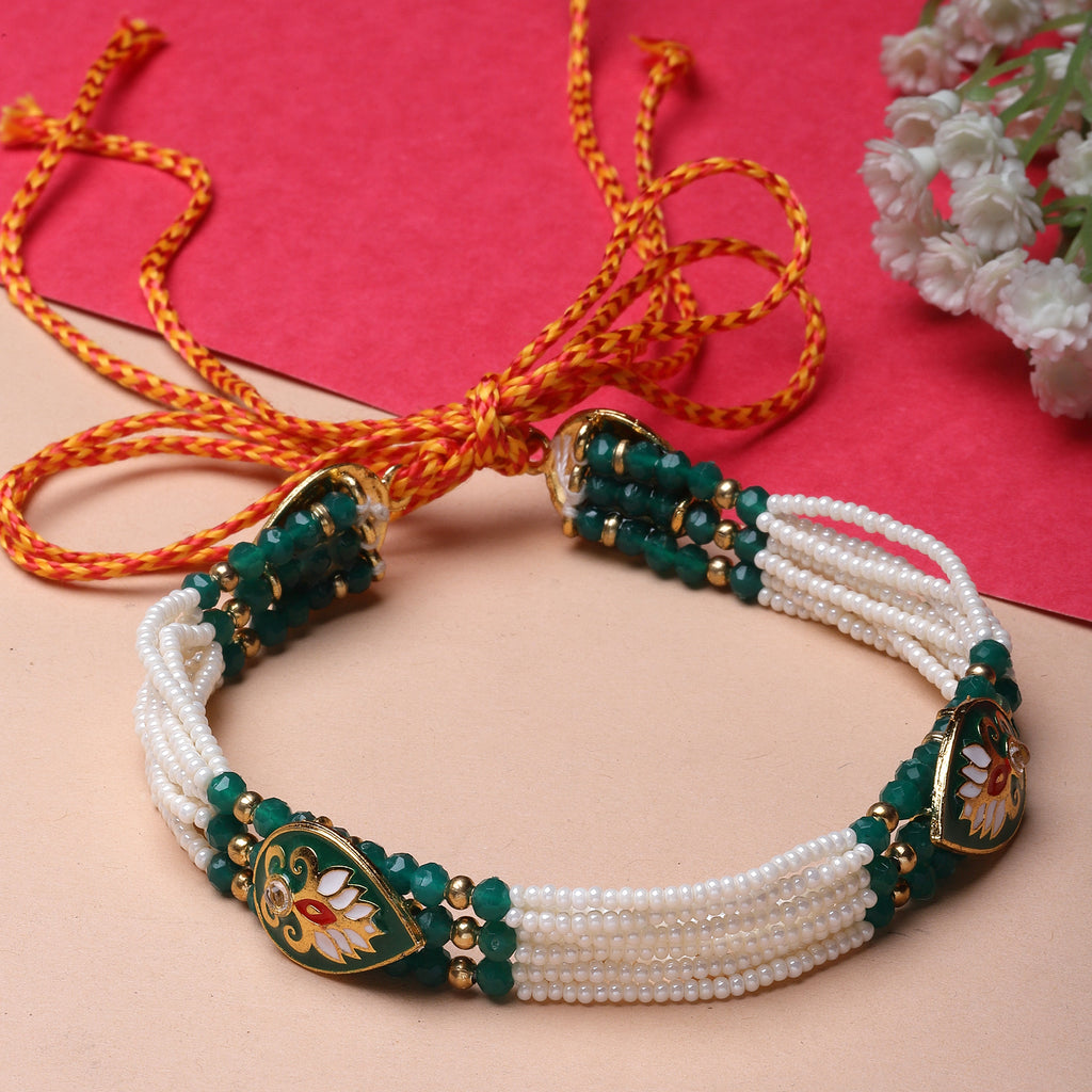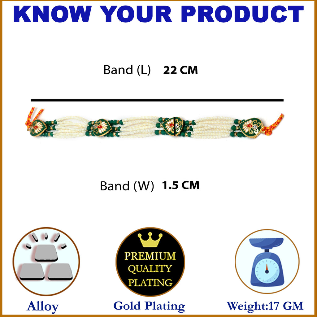 Elegant Design: .Theintricate Kundan motifs, delicate pearl strands, and rich emerald green detailing, adding a regal touch.