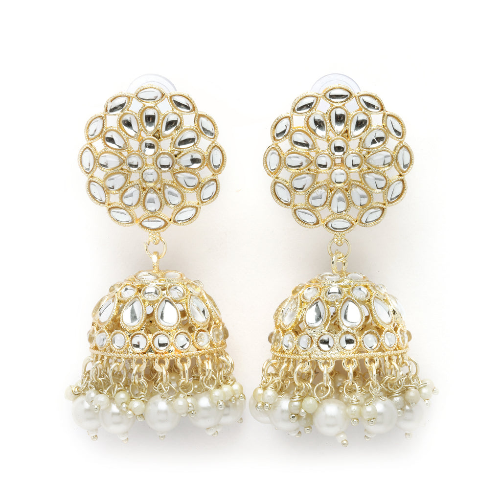 Gold-Plated White Kundan & White Pearls studded Flower Shaped Vilandi Jhumka Earrings
