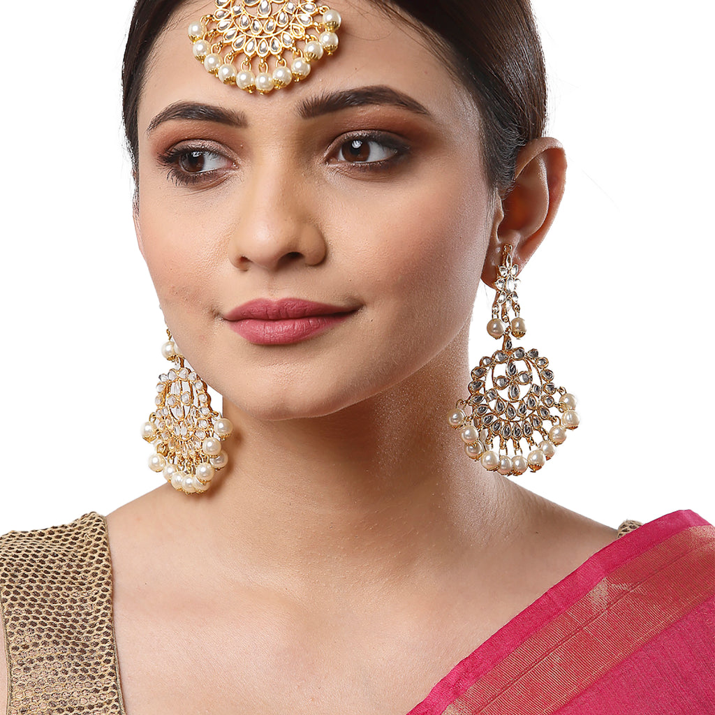 Gold-Plated White Pearl & Kundan Studded Maang Tikka With Earrings