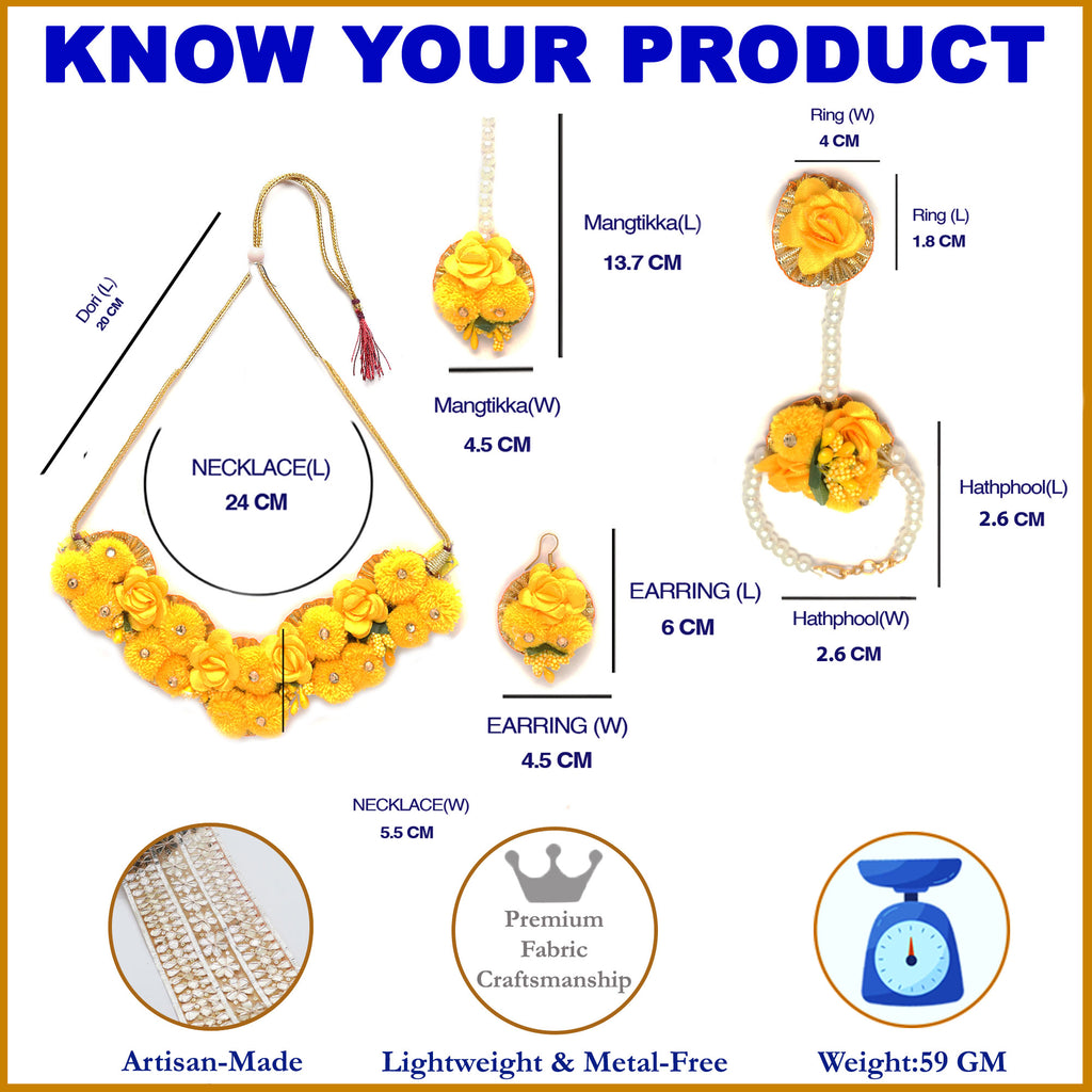 This jewellery set consists of a necklace, a pair of earrings, a pair haathphool with ring, a maangtikka. Gold-Plated yellow gota patti floral white pearls beaded necklace, secured with a drawstring closure. A pair of matching earrings, secured with a fishhook ear wire closure. A matching maang tikka, secured with a hook closure. A matching haathphool, secured with an hook closure.