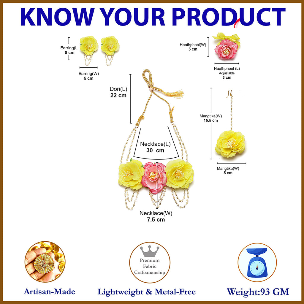 Gold-Plated Yellow-Pink Floral White Pearls Beaded Haldi & Mehendi Jewellery Set with Maang Tikka & Haathphool