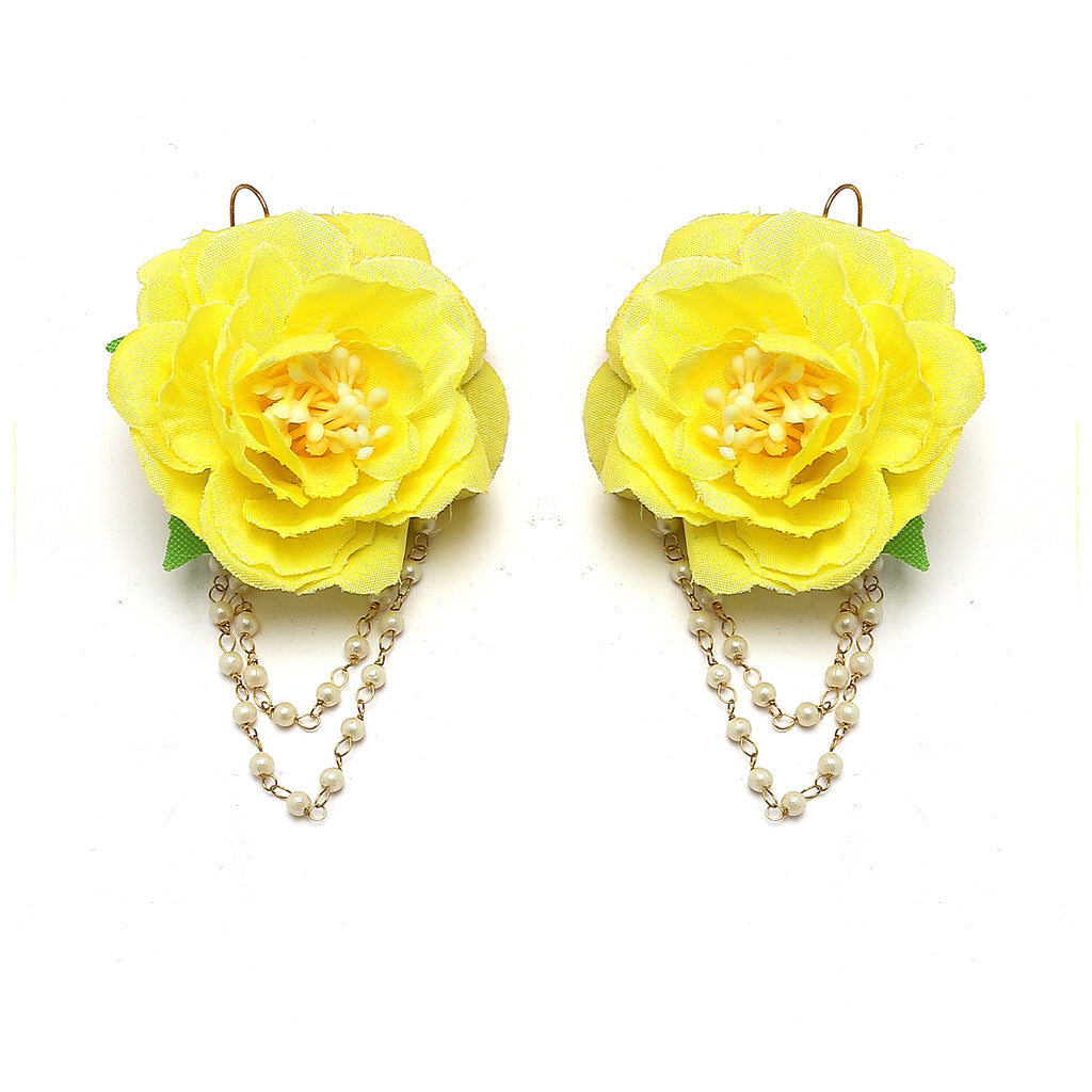 This jewellery set consists of a necklace, a pair of earrings, a pair haathphool, a maangtikka. Gold-Plated yellow-pink floral white pearls beaded necklace, secured with a drawstring closure. A pair of matching earrings, secured with a fishhook ear wire closure. A matching maang tikka, secured with a hook closure. A matching haathphool, secured with an insert closure.