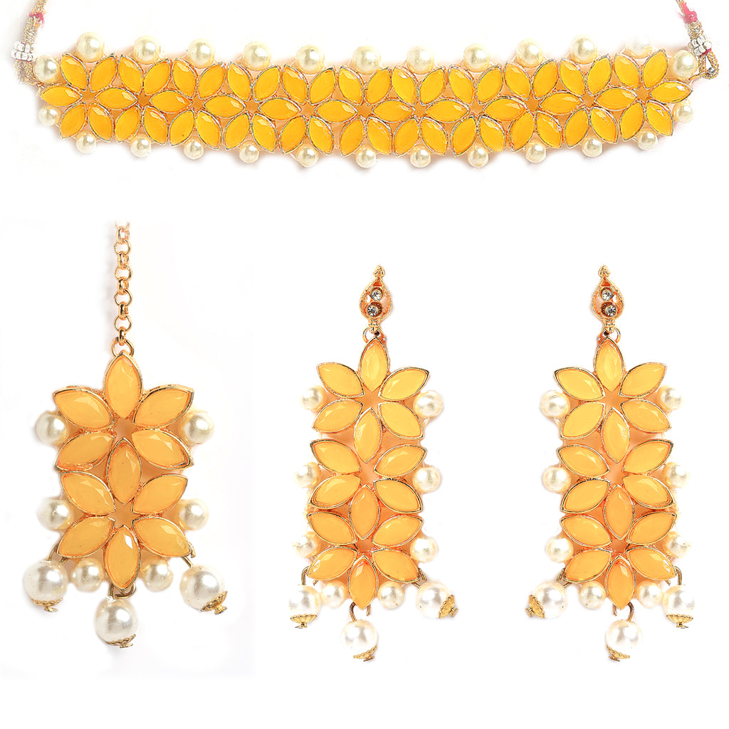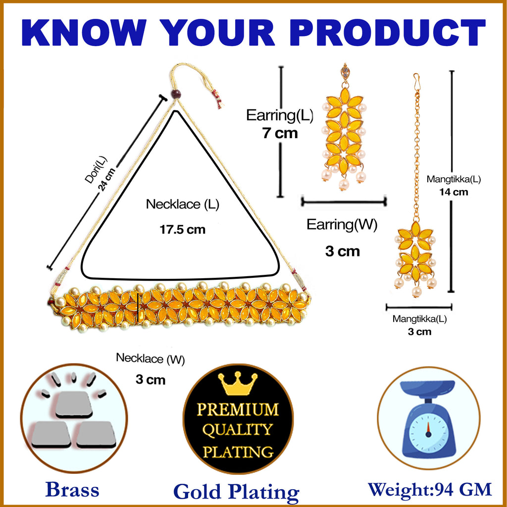This jewellery set consists of a necklace, a pair of earrings and maang-tika. Gold-Plated and yellow choker necklace has kundan detailing, secured with drawstring closure. A pair of matching drop earrings, secured with a post-and-back closure. It Comes with a matching maang-tika secured with a S-Hook Closure.