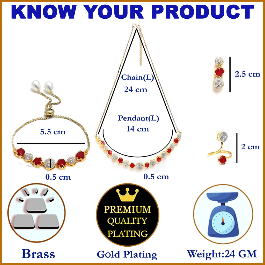 This jewellery set consists of a pair of earrings, a necklace, a bracelet and a ring. Red & White Gold-Plated American Diamond-Studded Necklace, secured with S-Hook closure. A pair of matching Red & White drop earrings, secured with a post and back closure. A matching adjustable ring, secured with lever back. A matching adjustable Red and White bracelet, secured with a drawstring closure.