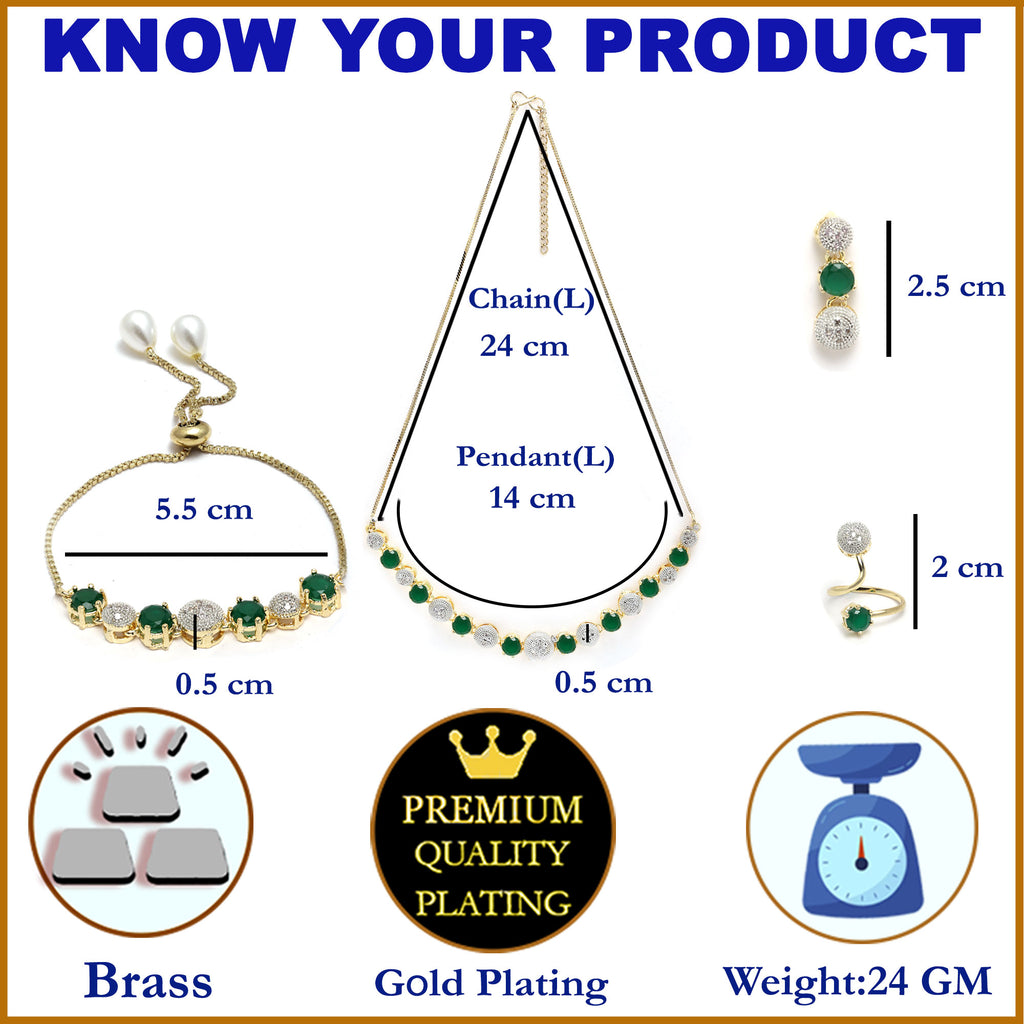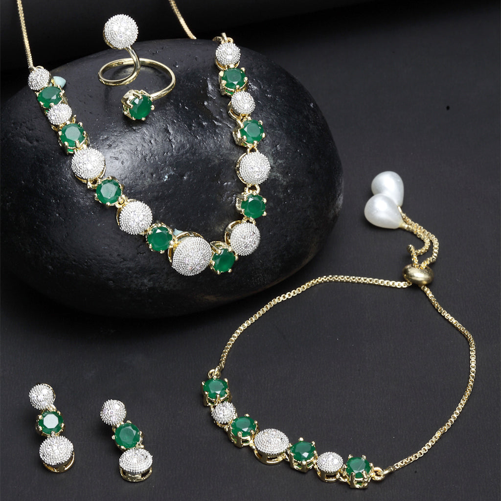 This jewellery set consists of a pair of earrings, a necklace, a bracelet and a ring. Green Gold-Plated American Diamond-Studded Necklace, secured with S-Hook closure. A pair of matching drop earrings, secured with a post and back closure. A matching adjustable ring, secured with lever back. A matching adjustable bracelet, secured with a drawstring closure.