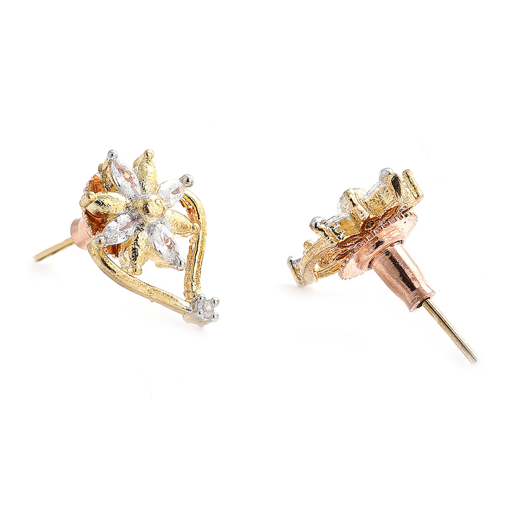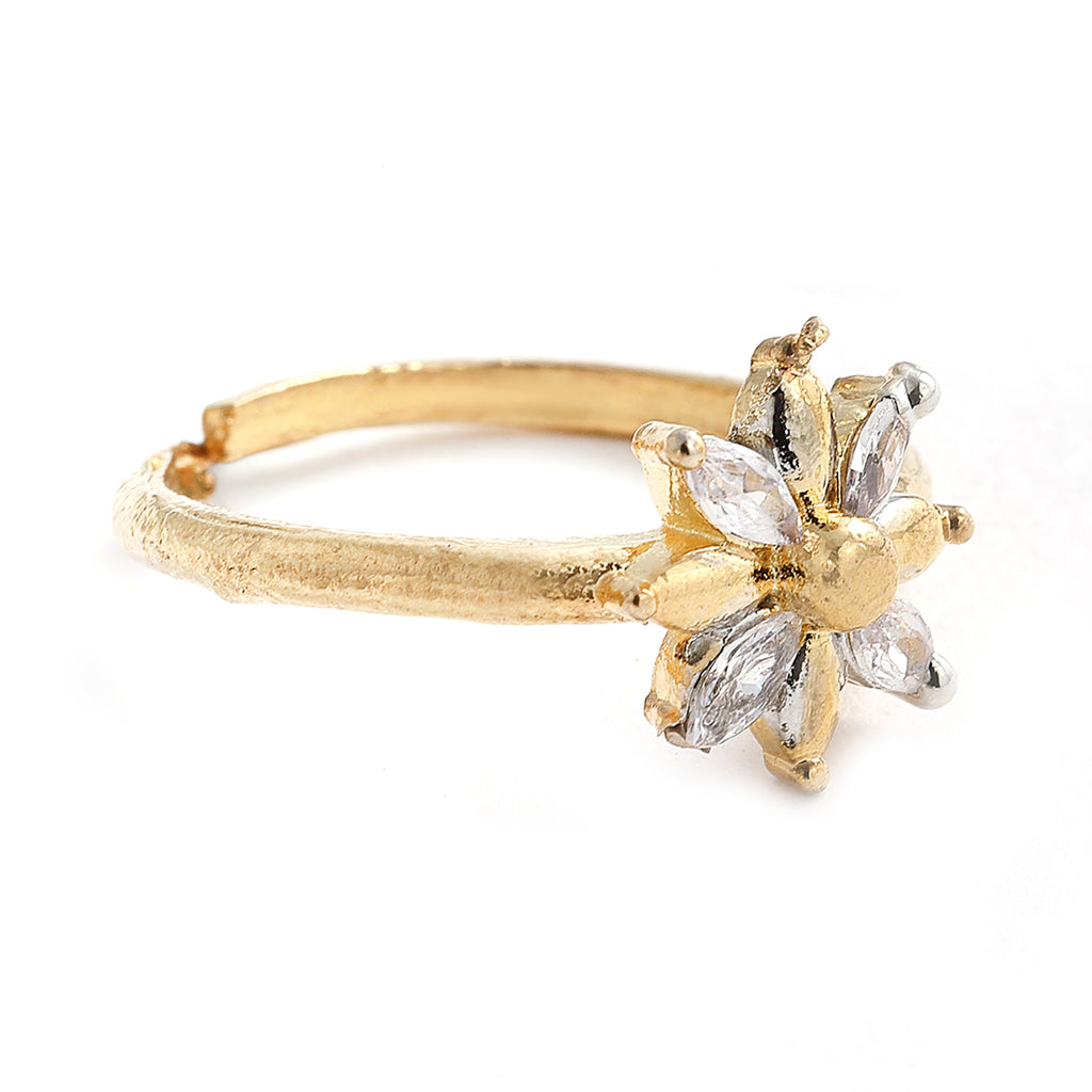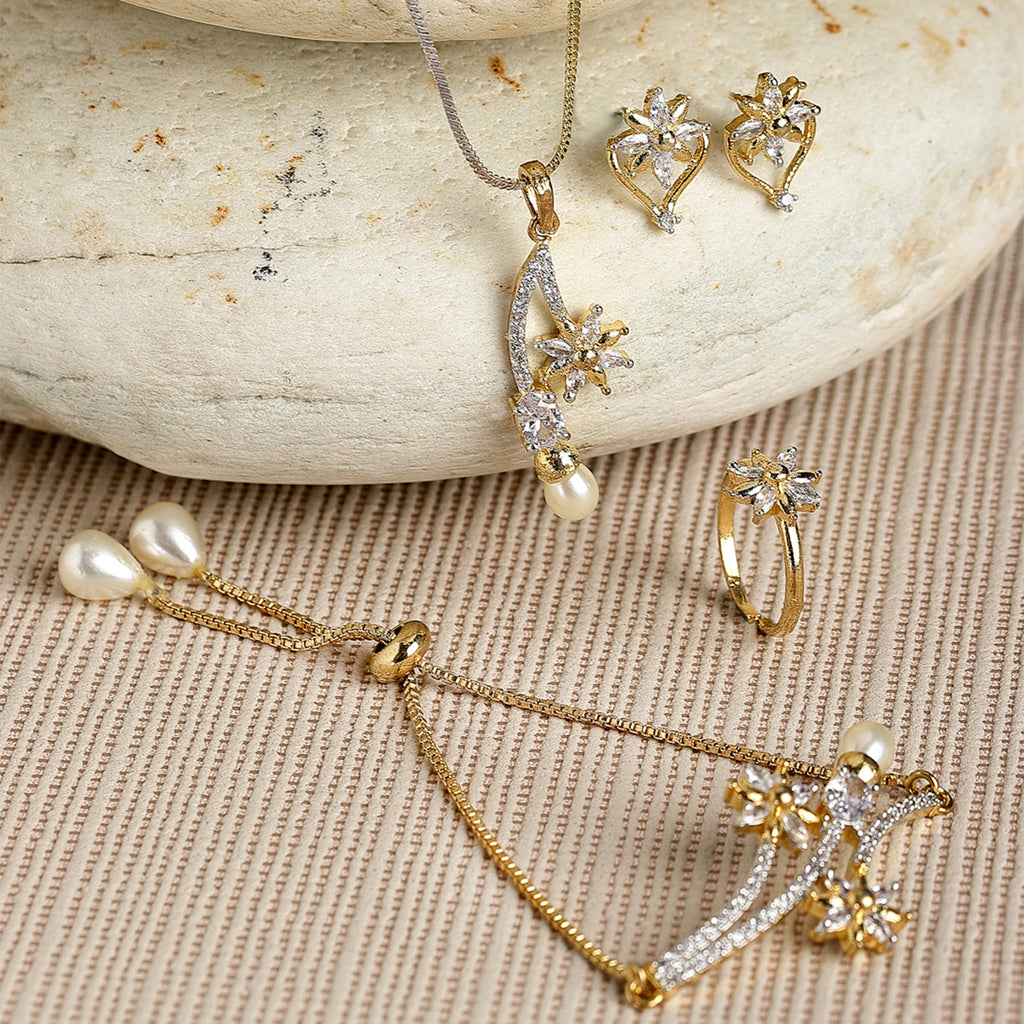 This Jewellery set consists of a pair of earrings, a pendant, a bracelet and a ring. Gold-Plated pendant, has White Flower & Leaf stone-studded floral detail, secured with S-Hook closure. A pair of matching stud earrings, secured with a post and back closure. A matching adjustable ring with Green & White floral stone-studded detail. A matching adjustable bracelet, secured with a drawstring closure.