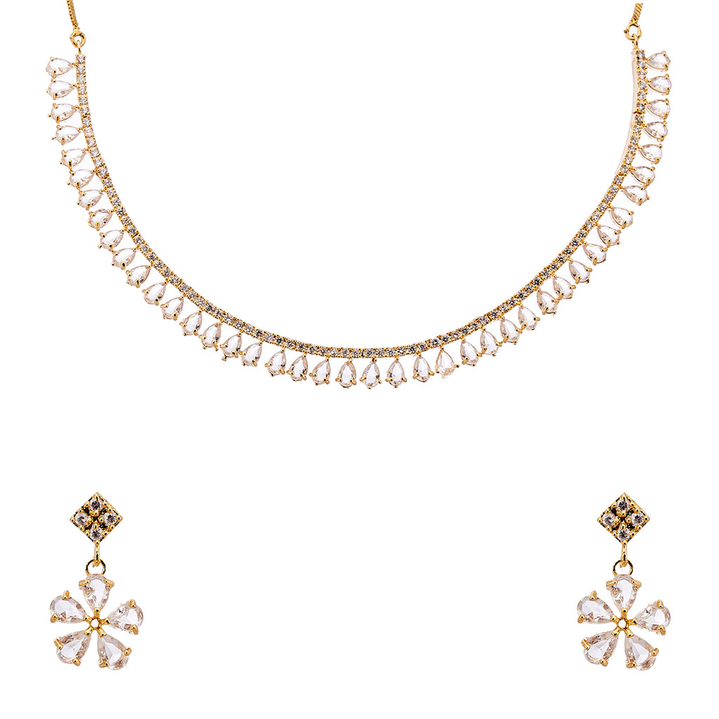 This jewellery set consists of a necklace and pair of earrings. Gold-Toned & Plated American Diamond Studded Jewellery Set secured with a S-hook Closure. A pair of matching earrings, secured with post and back closure