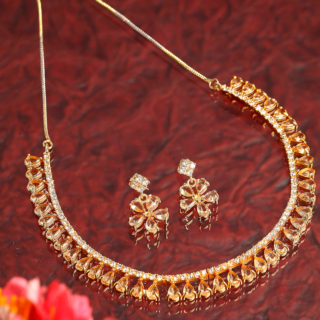 This jewellery set consists of a necklace and a pair of floral drop earrings. Gold-Plated necklace has white American Diamond-studded secured by S-hook closure. A pair of matching floral drop earrings, secured with a post-and-back closure.