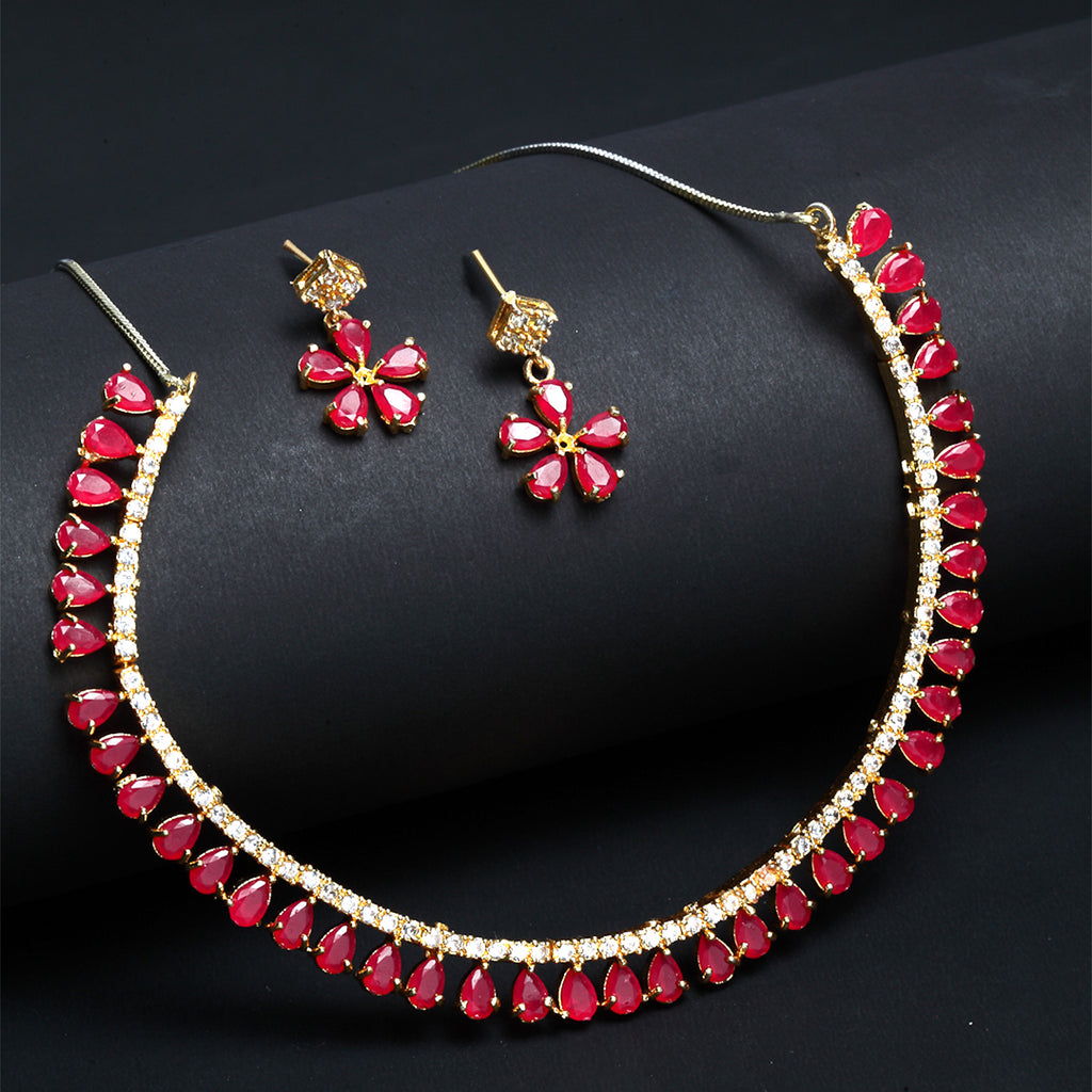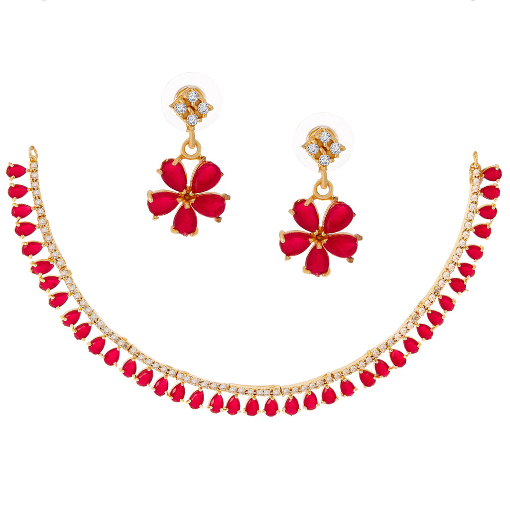 This jewellery set consists of a necklace and pair of floral earrings. Gold-plated necklace, has red and white American Diamond-studded detail, Secured with S-Hook. A pair of matching floral earrings, secured with post and back closure.