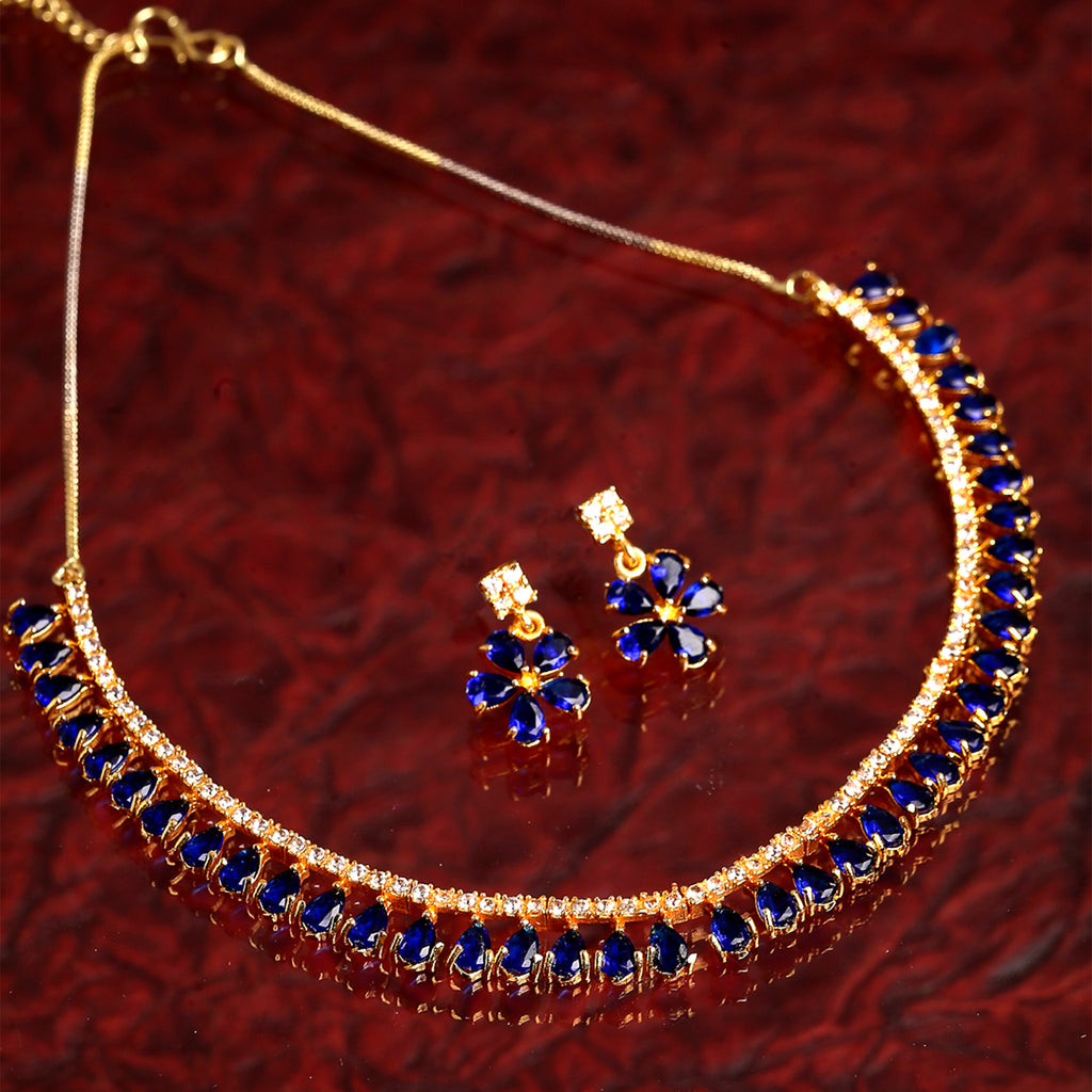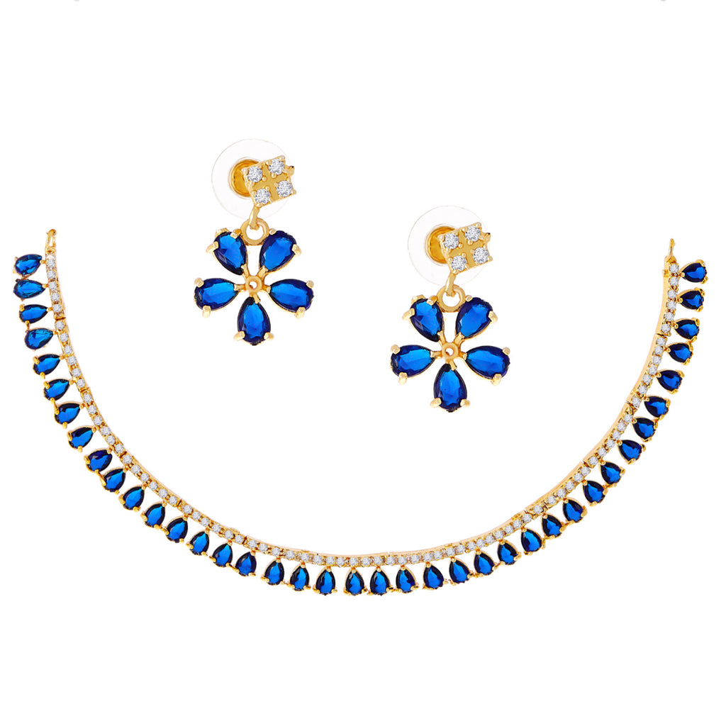 This jewellery set consists of a necklace and pair of earrings in floral shape. Gold-plated necklace, has navy blue American Diamond-studded. Secured with a S-hook Closure. A pair of matching earrings, secured with post and back closure.