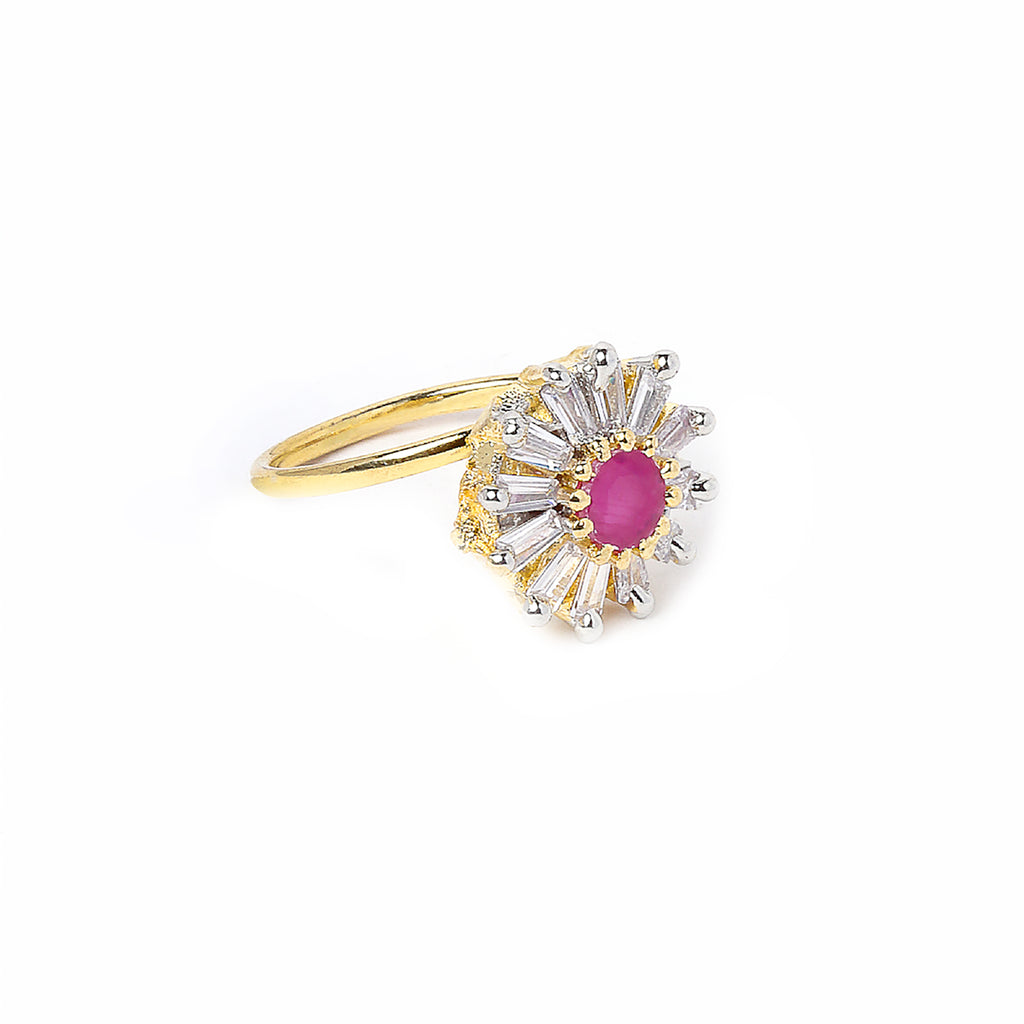 This Antique Designed Jewellery set consists of a Pendant, earrings, finger ring and bracelet. Gold-Plated flower shaped American Diamond stone pendant, comes with a chain, secured with a S-Hook closure. A pair of matching Red American Diamond stone Stud earrings, secured with a post and back closure. Gold-Plated adjustable finger ring, has white stone-studded detail secured with lever back closure. Gold-Plated American Diamond stone Studded embelish bracelet, secured with draw string.