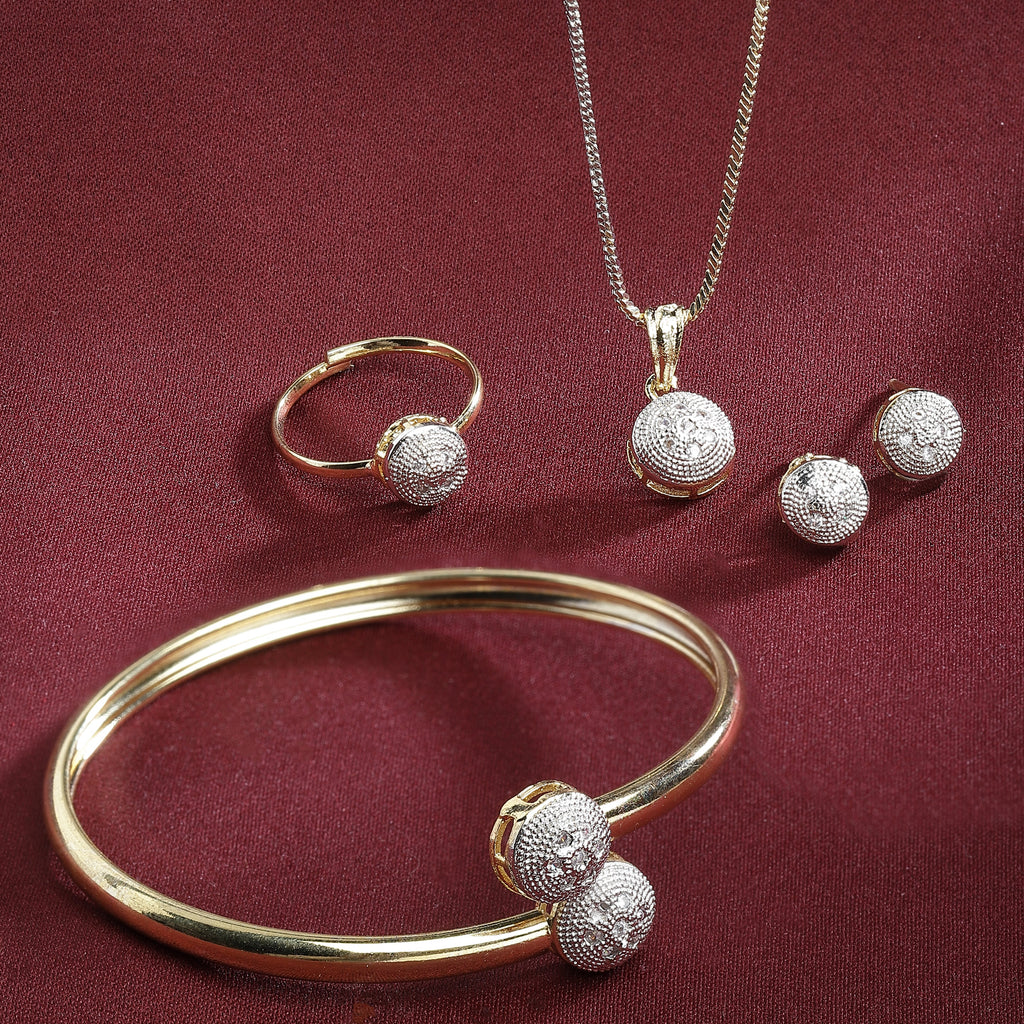 Set consists of a necklace, earrings, finger ring and bracelet. Gold-Plated american diamond studded pendant, comes with a chain, secured with a S-Hook closure. A pair of matching stud earrings, secured with a post and back closure. Gold-Plated adjustable finger ring, has white stone-studded detail. Gold-Plated bracelet, has white stone-studded, secured with lever back closure.