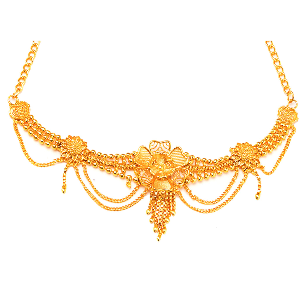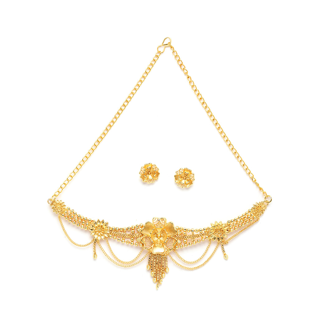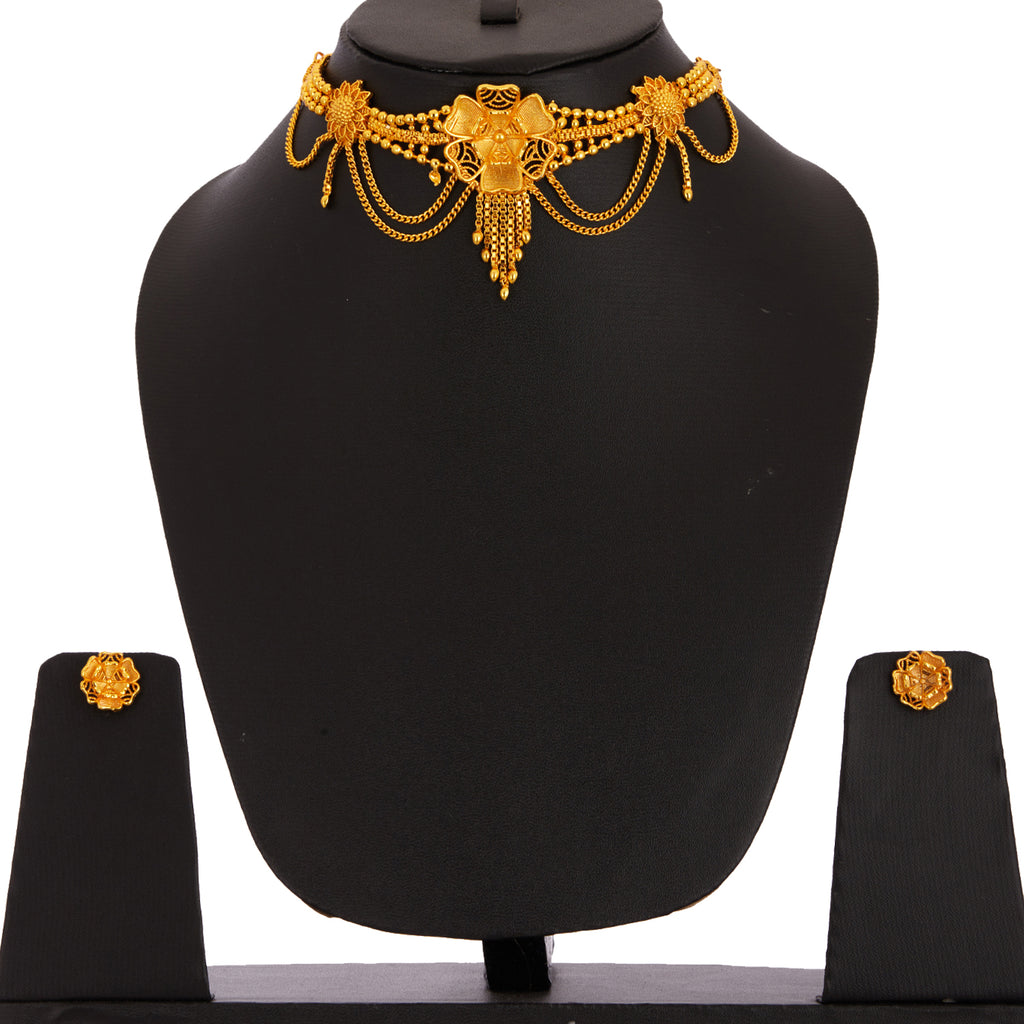 This set consists of a temple necklace and pair of earrings. Gold-Plated floral necklace with intricate textured detailing and designer strings, secured with a S-Hook closure. A Pair Of matching stud earrings, secured with post and back closure.