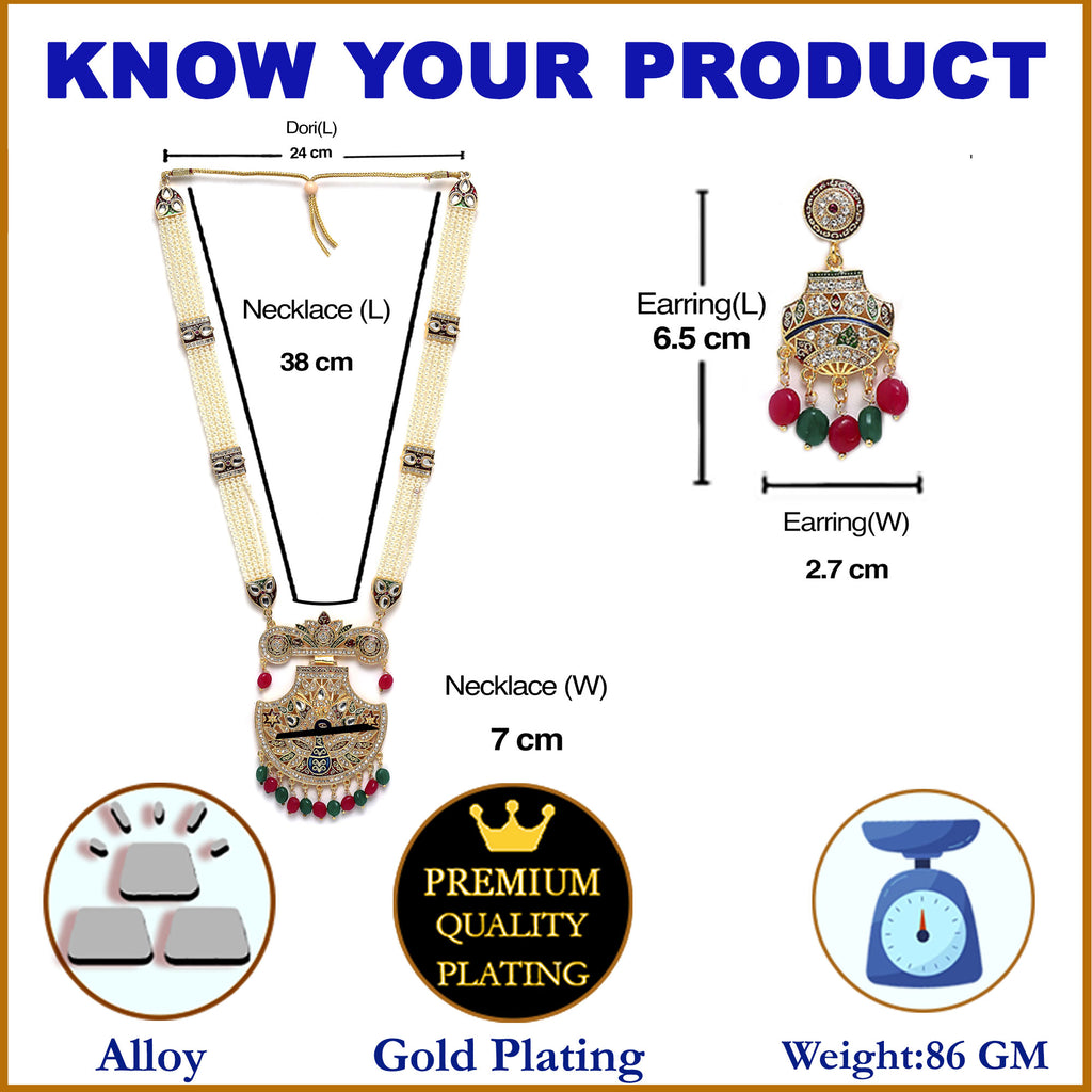 This jewellery set consists of a multistrand necklace and a pair of earrings. Gold-Plated meenakari multistrand necklace, has white Kundan-studded and white, pink and green pearl beaded peacock centrepiece with droplets, secured with an adjustable drawstring fastening. A pair of matching drop earrings, each secured with a post-and-back closure.