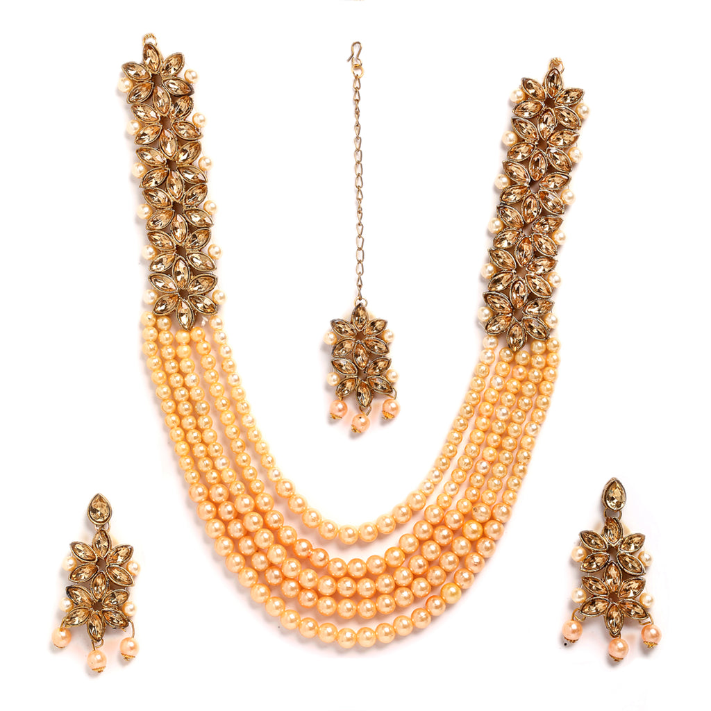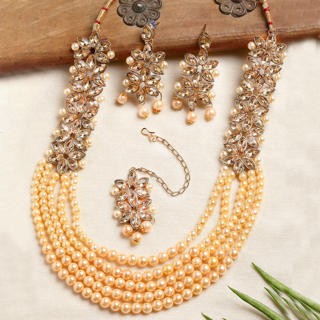 Champagne Kundan Studded & Pearl Beaded Multi-Stranded Jewellery Set
