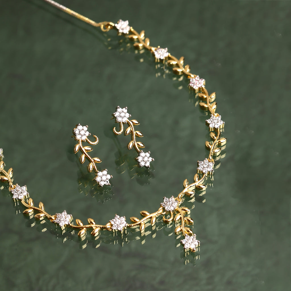 This jewellery set consists of a necklace and a pair of earrings gold-plated leaf and flower handcrafted necklace, has silver-toned American Diamond-studded details
