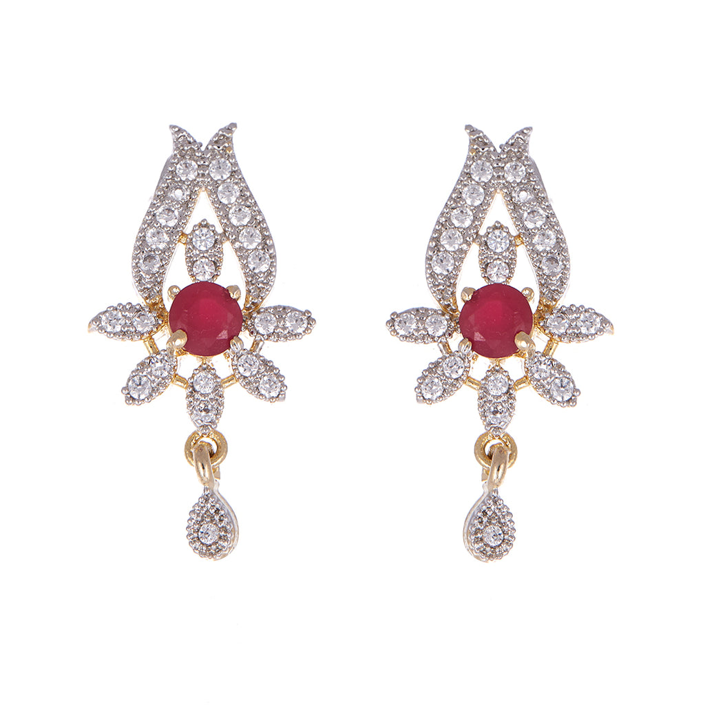 Gold Plated American Diamond Studded Star Drop Red Stone Black Beaded Magalsutra With Earring Traditional Jewellery For Women
