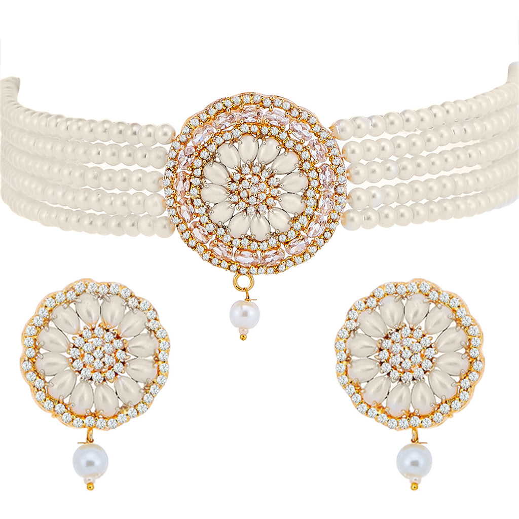 Gold-Toned White Stone-Studded & Pearl Beaded Choker Jewellery Set