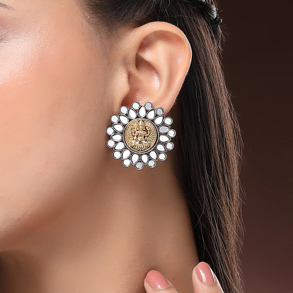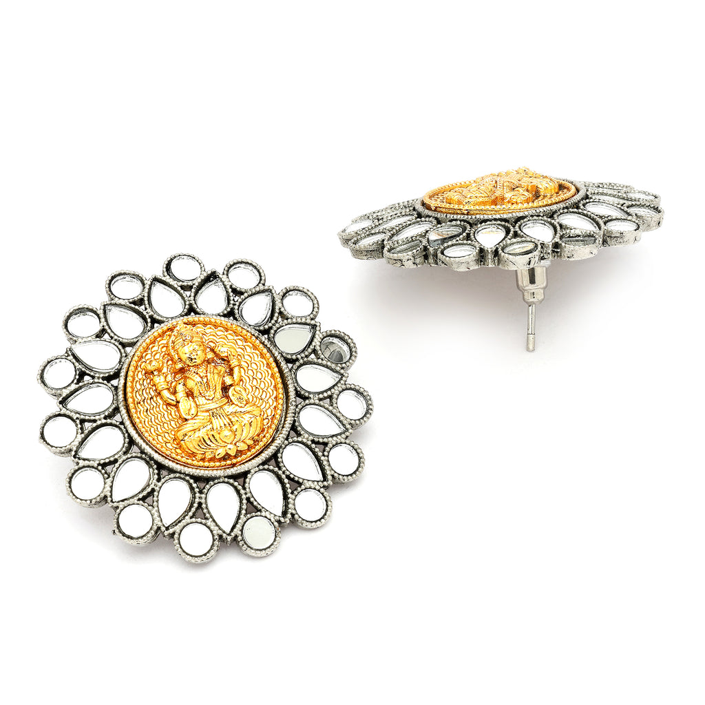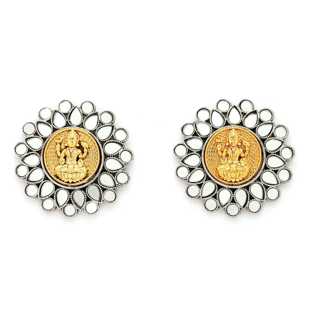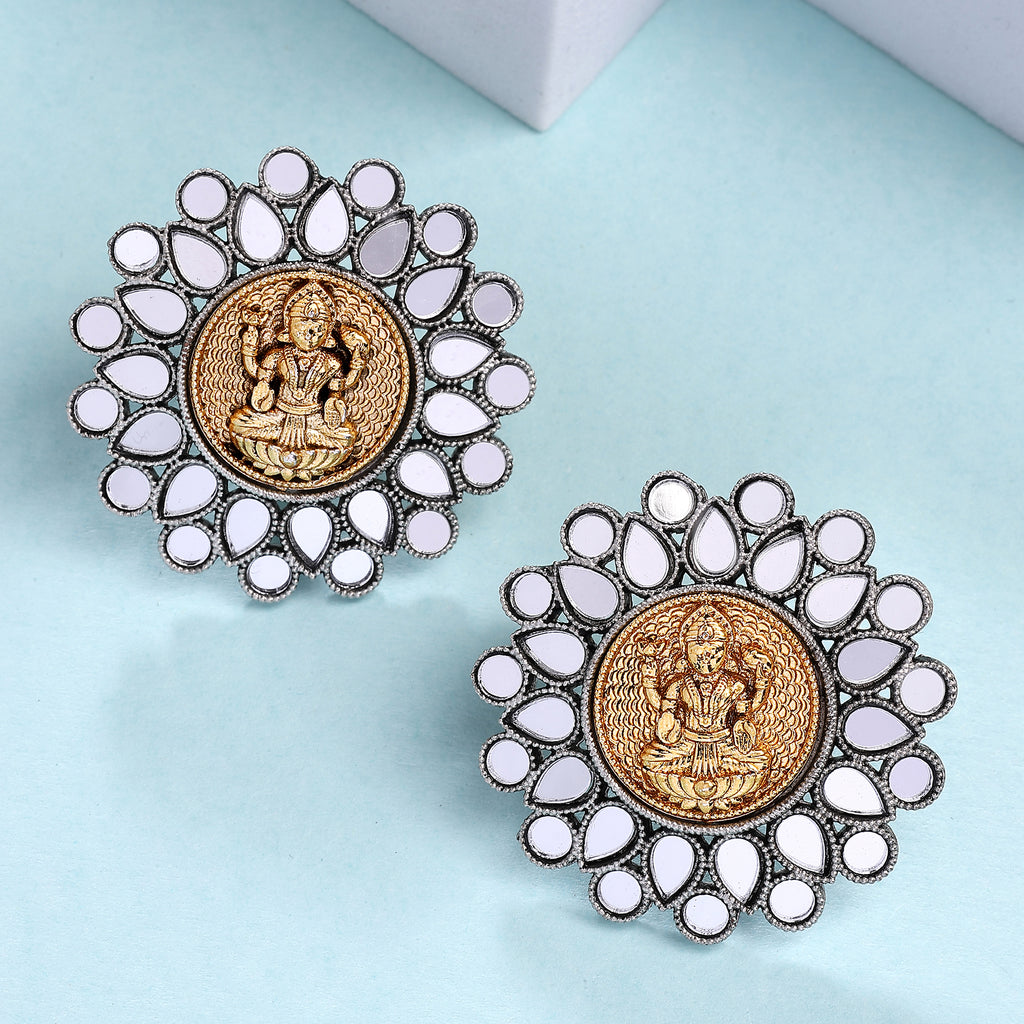Elegant Design: This Oxidised dual toned goddess Laxmi earrings detail with Mirror adding a touch of elegance to any look.