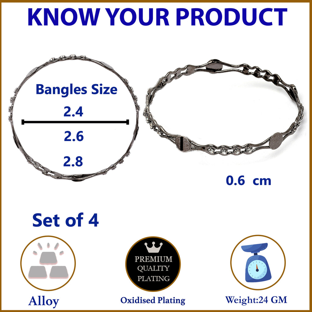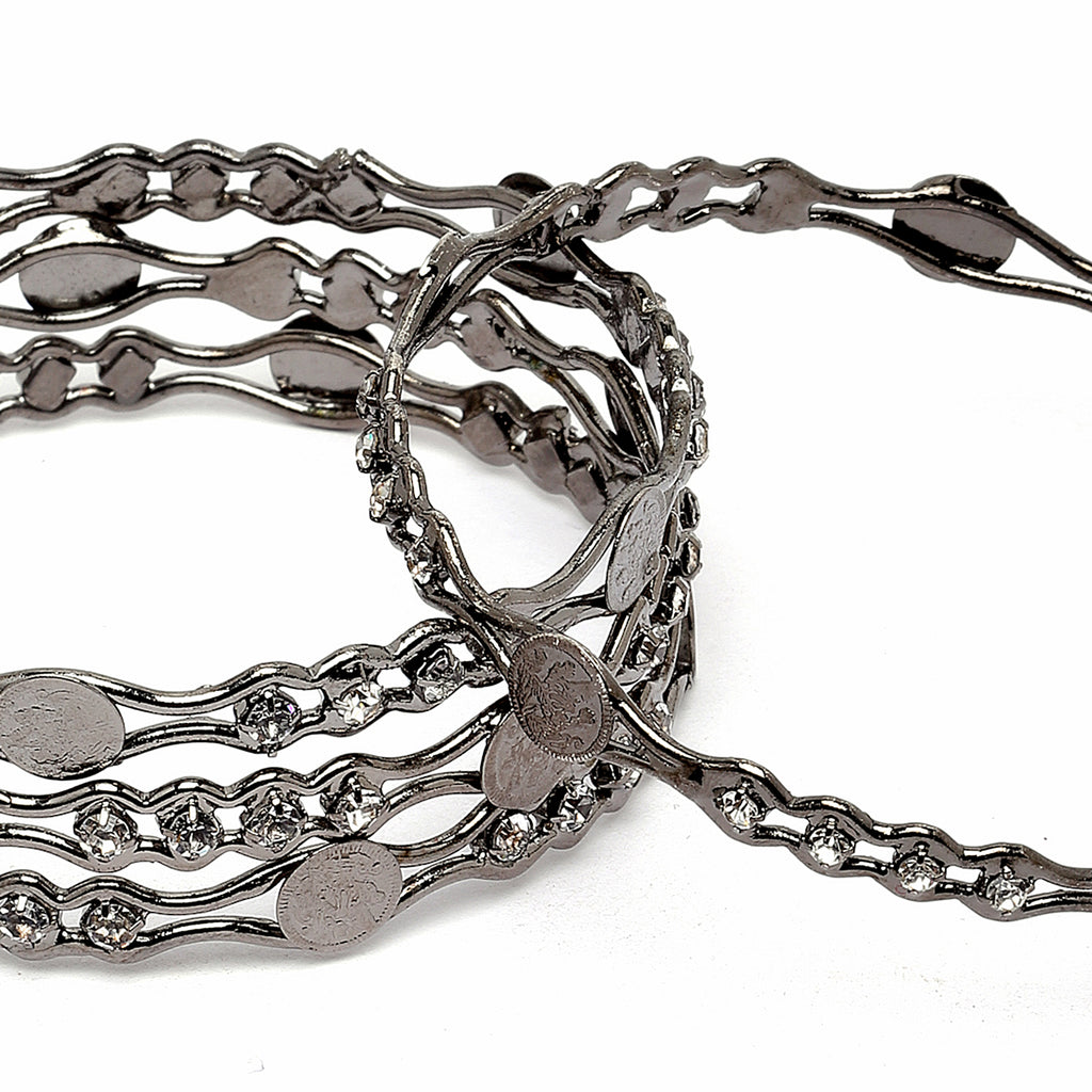 Oxidised Silver-Plated Black Toned White American Diamond studded Temple Coin Bangles Jewellery Set (Set Of 4)