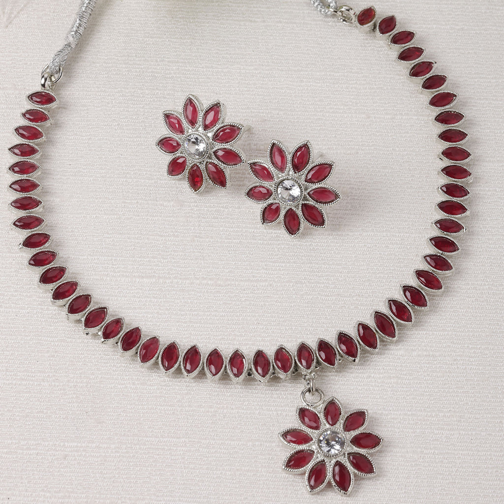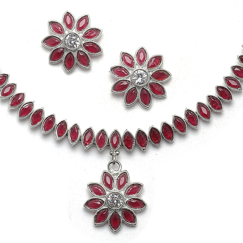 Oxidised Silver-Plated Flower & Leaf Red American Diamond Studded Necklace Earrings Jewellery Set