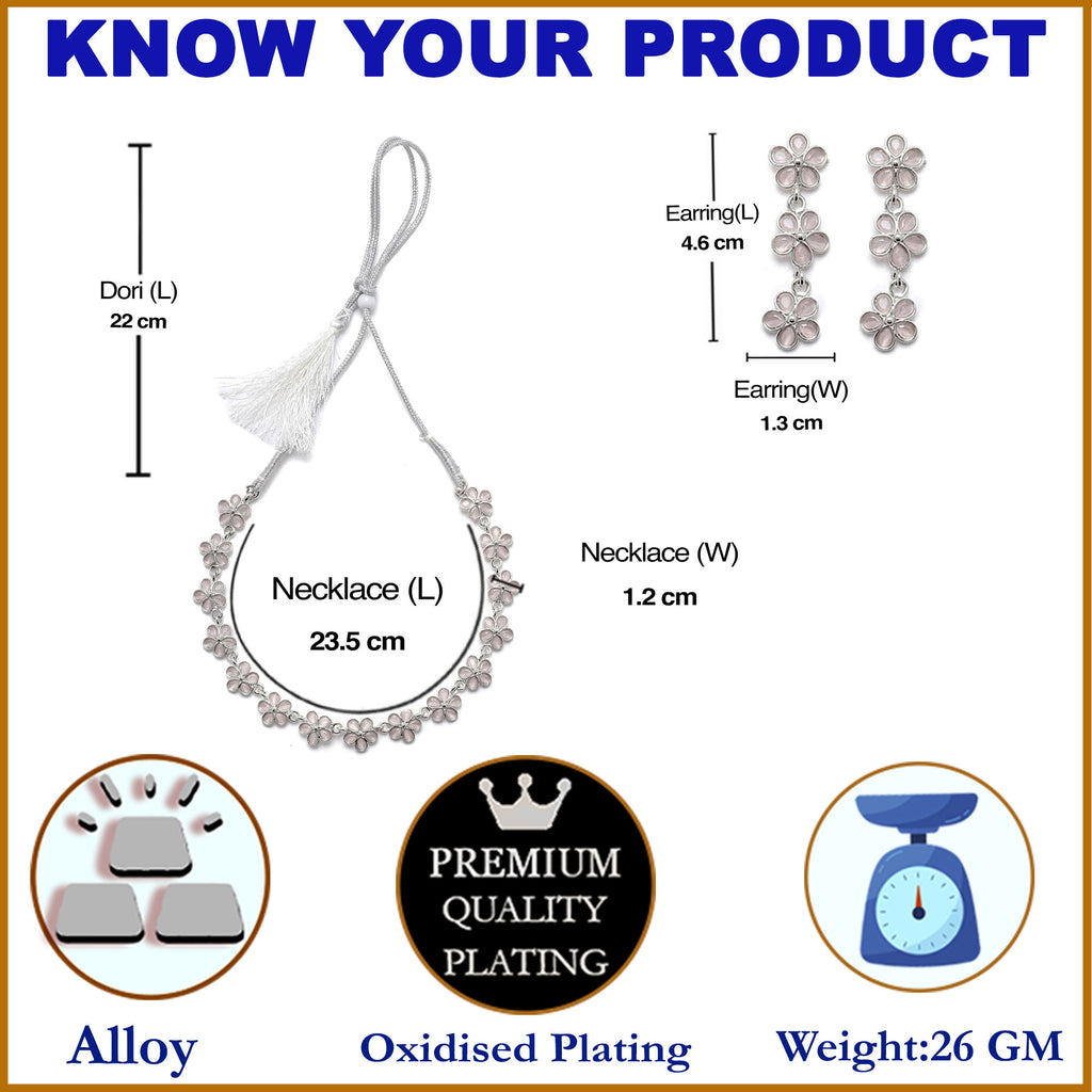 Oxidised Silver-Plated Flower Shaped Pink American Diamond Studded Necklace Earrings Jewellery Set