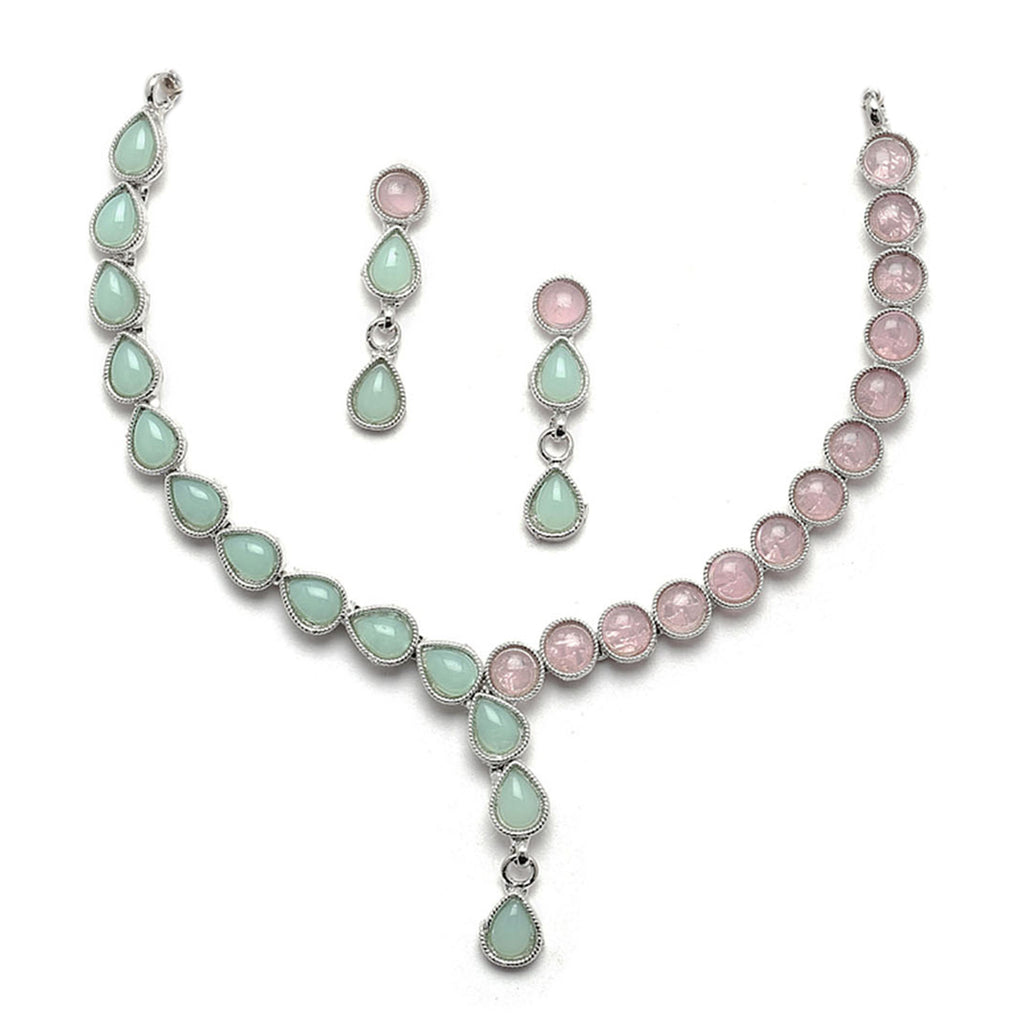 Oxidised Silver-Plated Lime Green-Pink American Diamond Studded Necklace with Earrings Jewellery Set