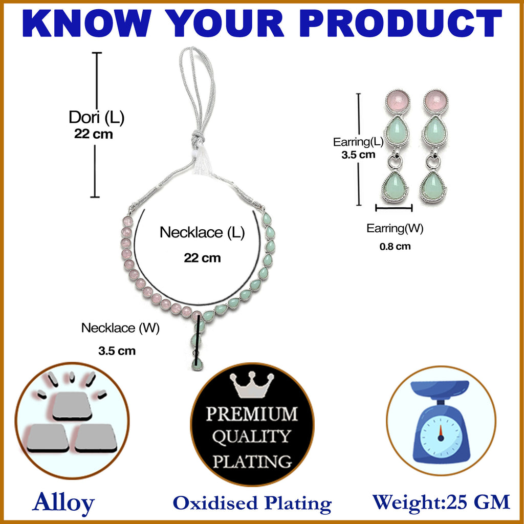 This jewellery set consists of a necklace and a pair of earrings. Oxidised Silver-Plated lime green and pink american diamond studded necklace, has secured with adjustable drawstring closure. A pair of matching drop earrings, each secured with a post and back closure.