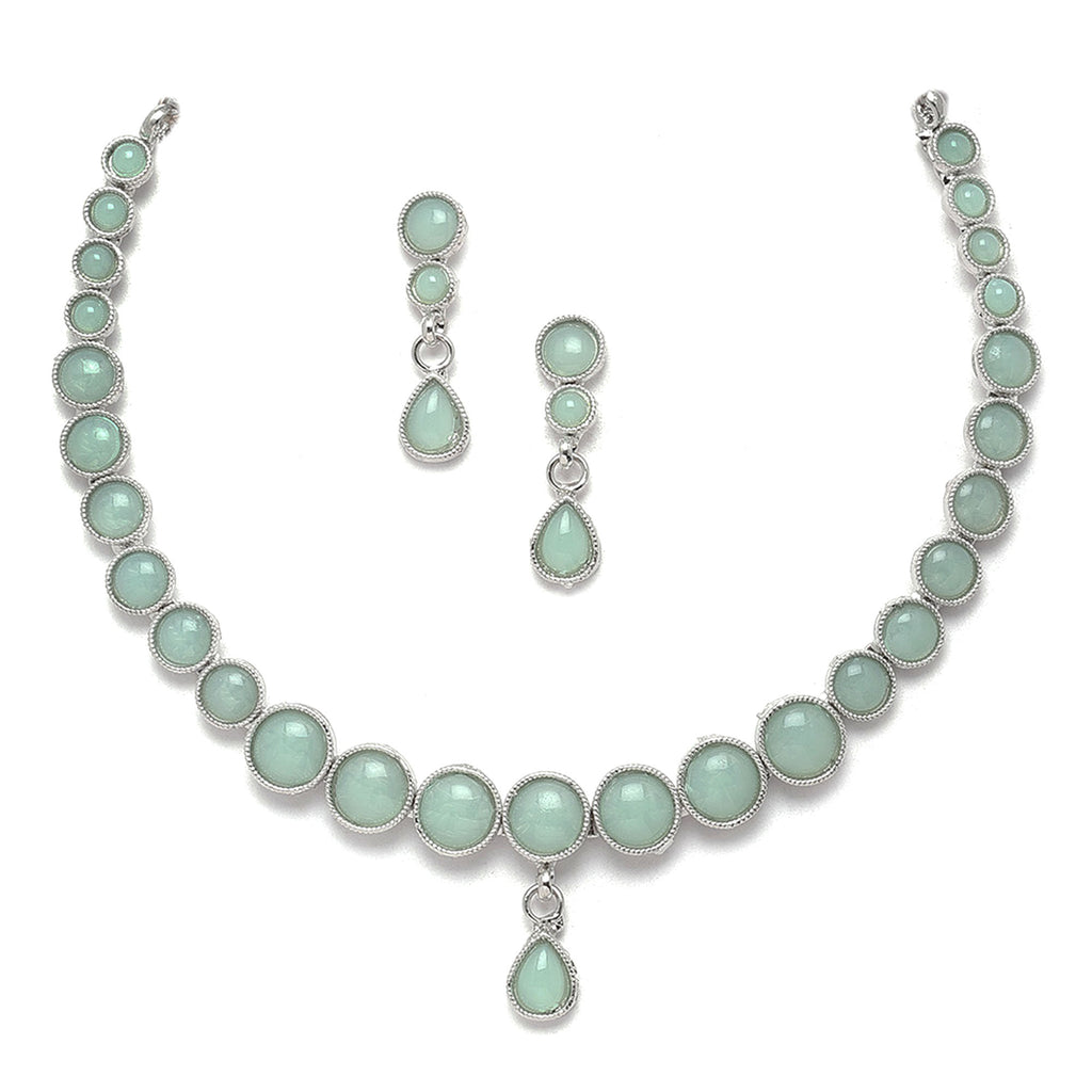 Oxidised Silver-Plated Lime Green Round American Diamond Studded Necklace with Earrings Jewellery Set