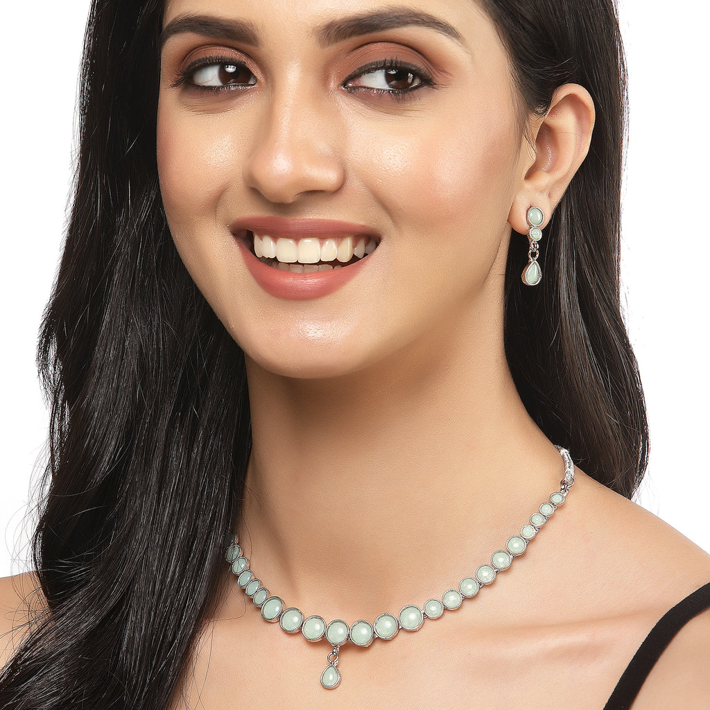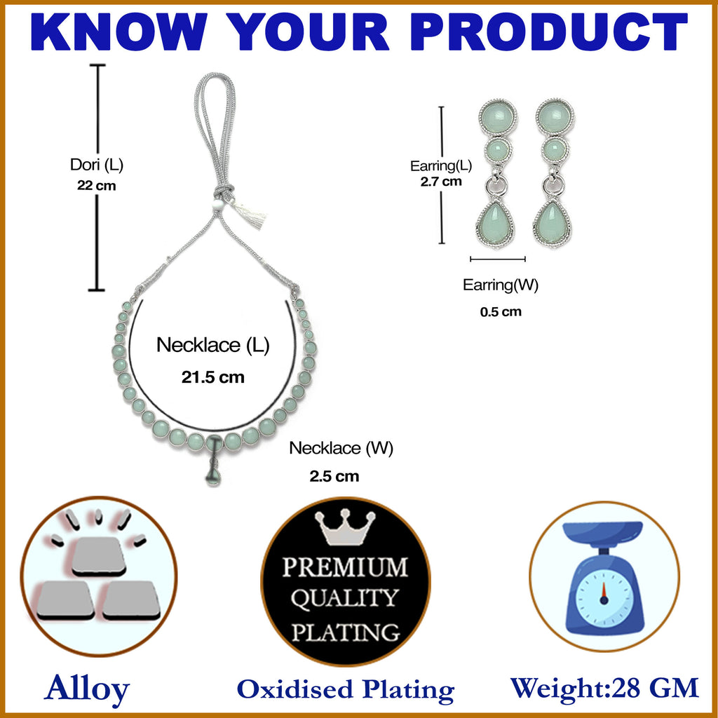 This jewellery set consists of a necklace and a pair of earrings. Oxidised Silver-Plated lime green american diamond studded necklace, has secured with adjustable drawstring closure. A pair of matching drop earrings, each secured with a post and back closure.