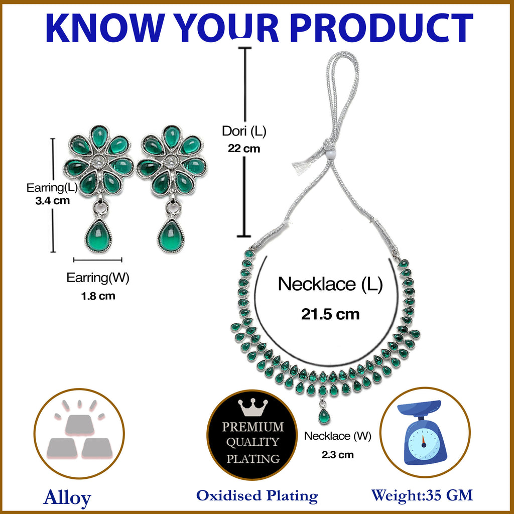 This jewellery set consists of a necklace and a pair of earrings. Oxidised Silver-Plated green american diamond studded necklace, has secured with adjustable drawstring closure. A pair of matching drop earrings, each secured with a post and back closure.