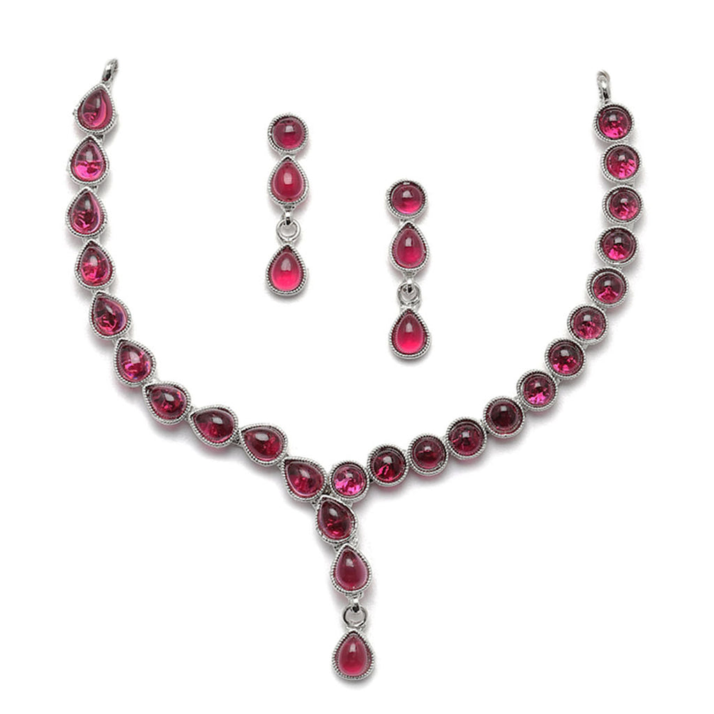 Oxidised Silver-Plated Red American Diamond Studded Necklace with Earrings Jewellery Set