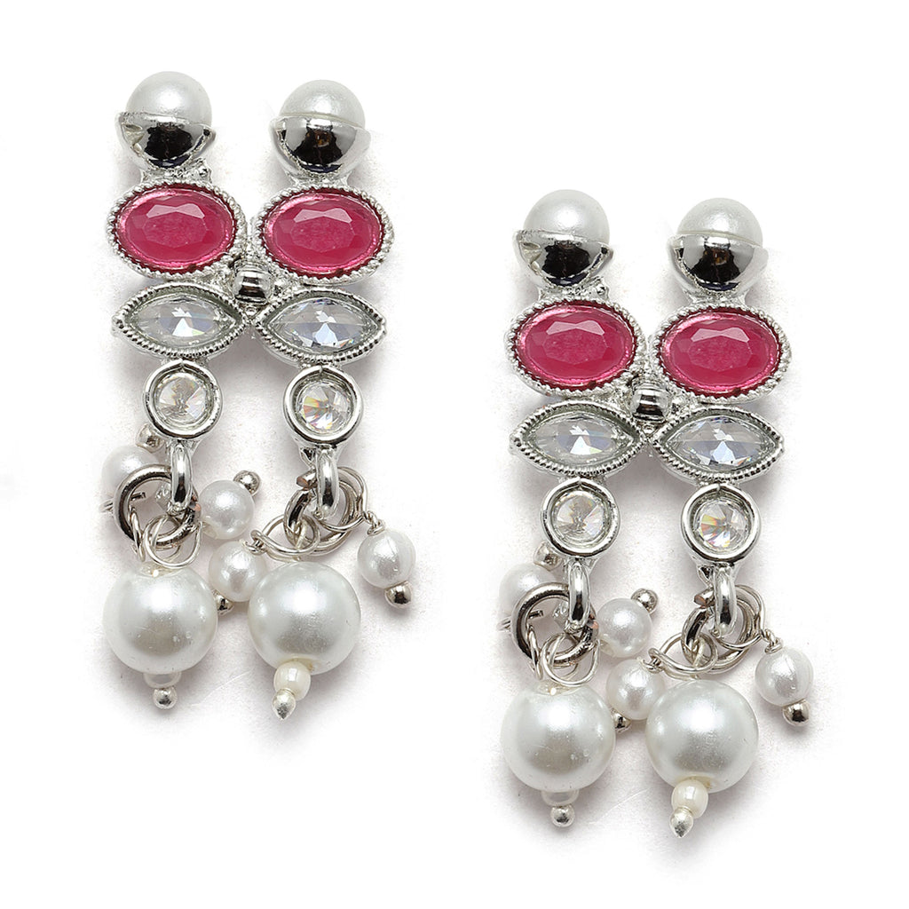This jewellery set consists of a necklace and a pair of earrings. Oxidised Silver-Plated red american diamond and white pearls studded necklace, has secured with adjustable drawstring closure. A pair of matching drop earrings, each secured with a post and back closure.