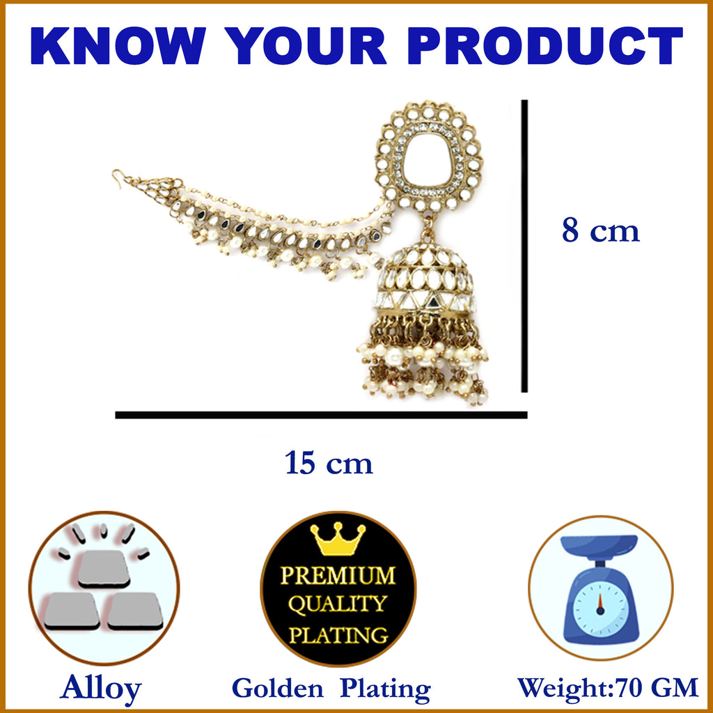 Oxidised Silver-Plated White Jhumka Earrings with Ear Chain, has Pearls studded secured with Post and Back closure.