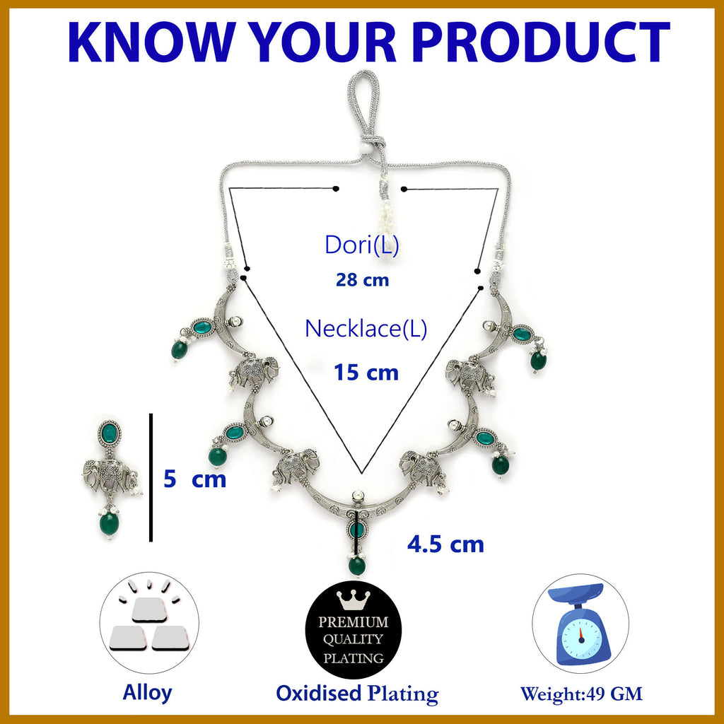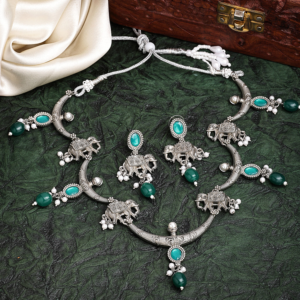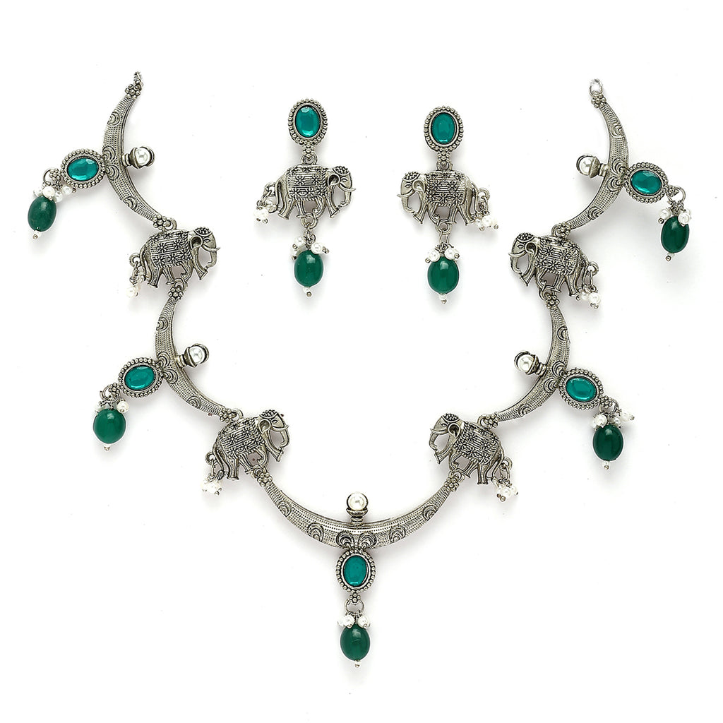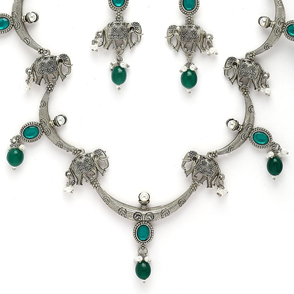 Traditional Design: Oxidized-plated necklace set featuring intricate designs with green pearls and stones, enhancing its royal and vintage appeal.