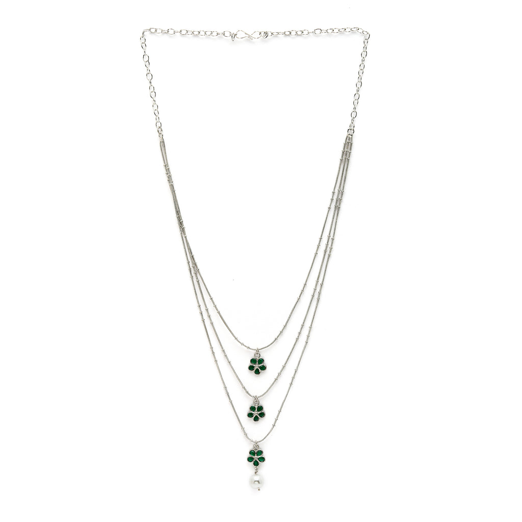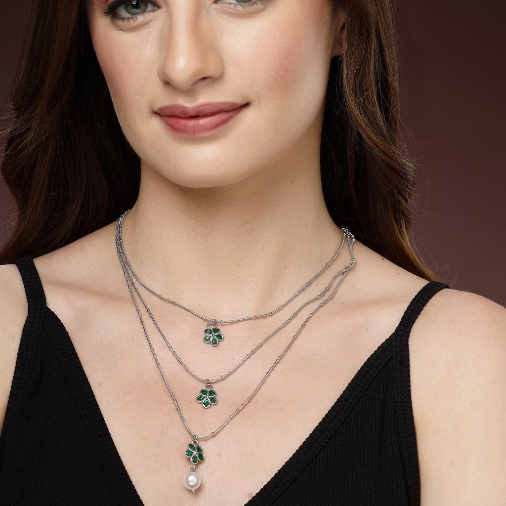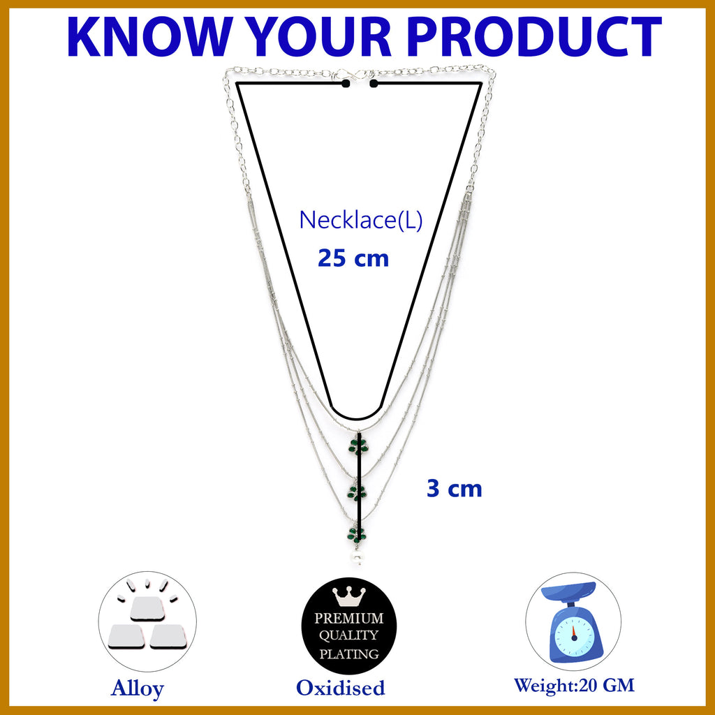 Elegant 3-Layered Design: Oxidized-plated necklace set featuring a beautiful 3-layered design with pearls and green stones, offering a rich, layered look.