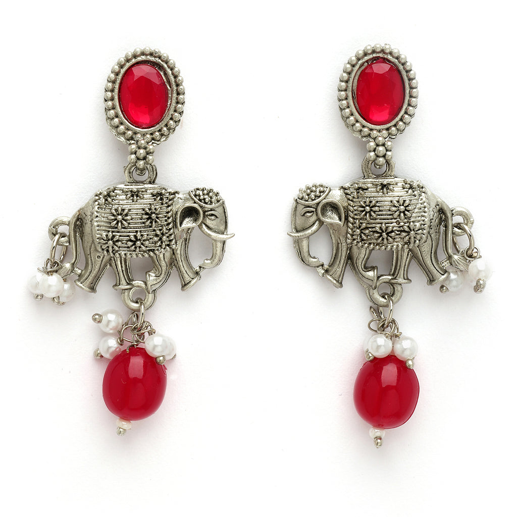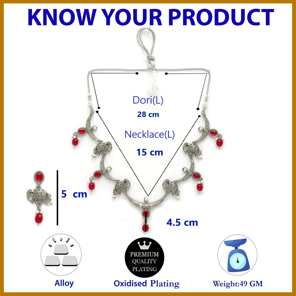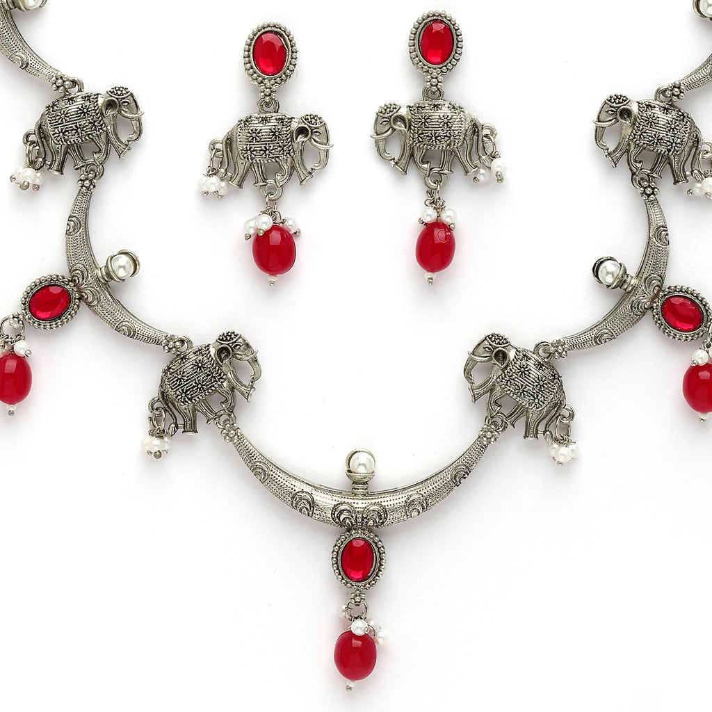 Traditional Design: Oxidized-plated necklace set featuring intricate designs with red pearls and stones, enhancing its royal and vintage appeal.