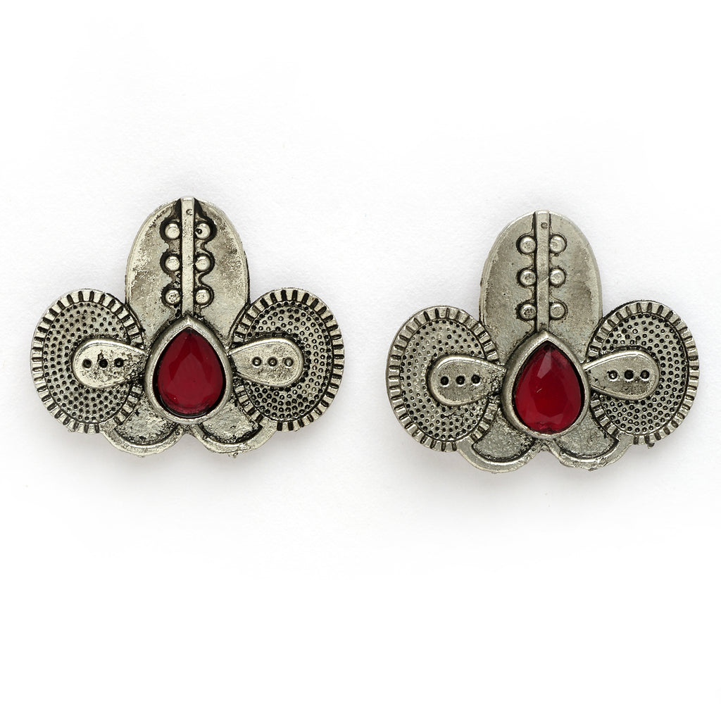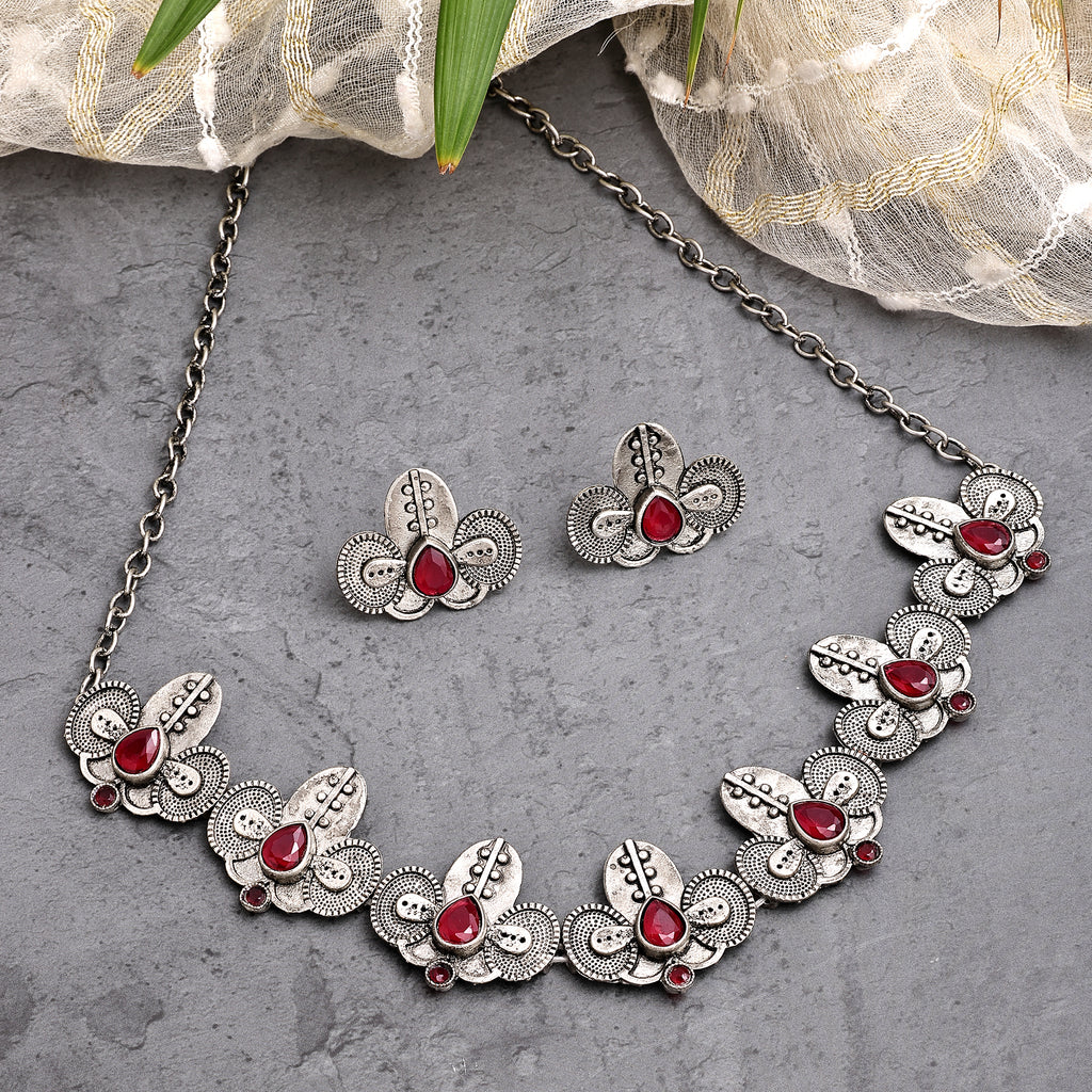 Timeless Design: Oxidized-plated necklace set with intricate silver filigree patterns, enhanced with red pearls for a sophisticated and vintage look.