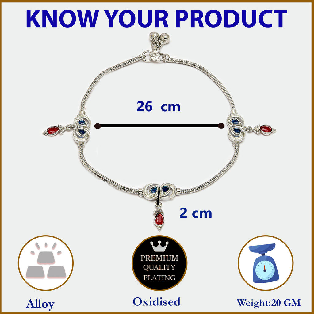 Rhodium Plated Silver Toned Red & Blue cubic Zirconia studded Charm Anklets