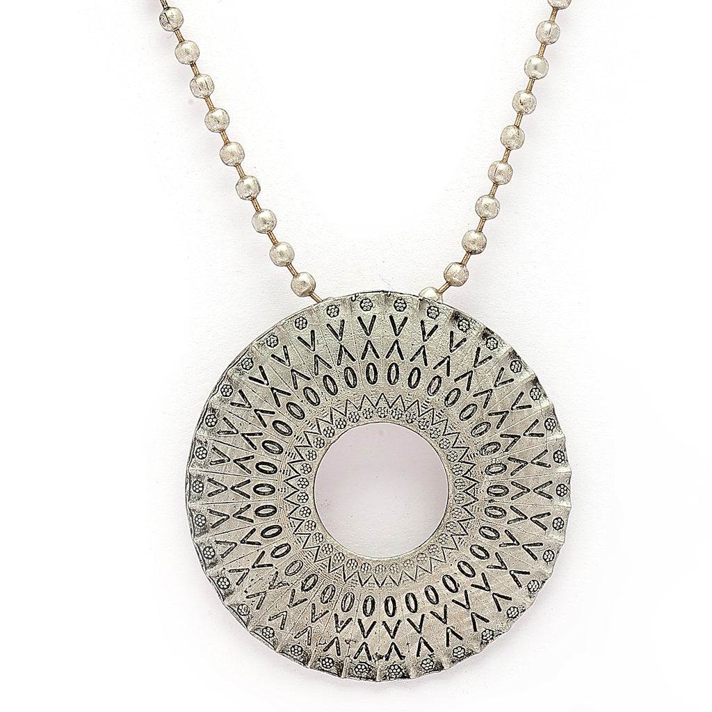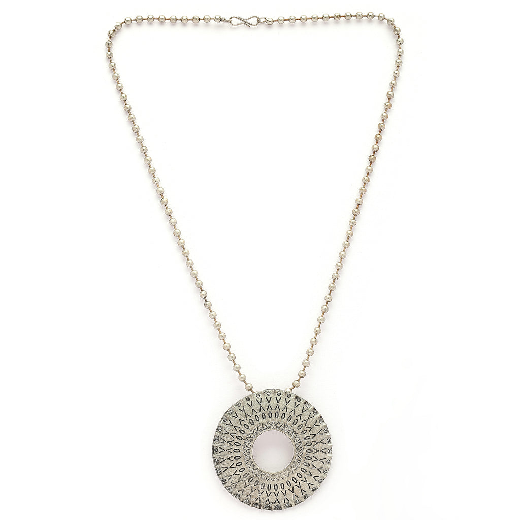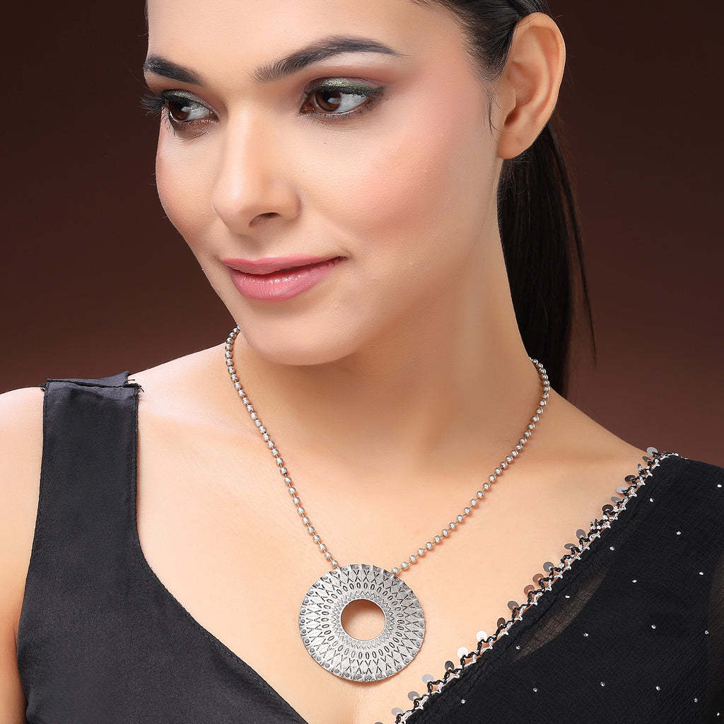 Elegant Design: This oxidized silver-toned necklace showcases Halo circular pendant. Its textured finish and elegant detailing create a balanced, stylish, and effortlessly charming look.
