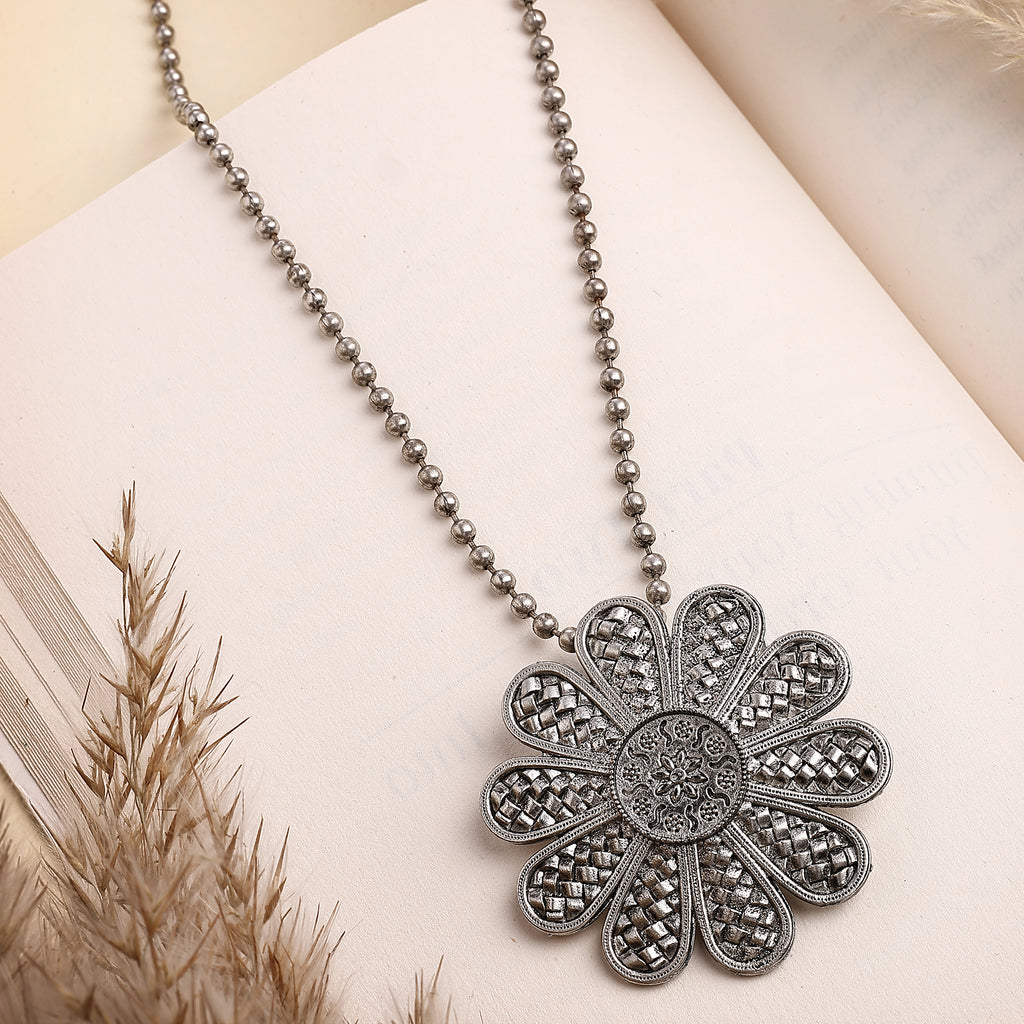 Elegant Design: This oxidized silver-toned necklace showcases a floral pendant. Its textured finish and elegant detailing create a balanced, stylish, and effortlessly charming look.