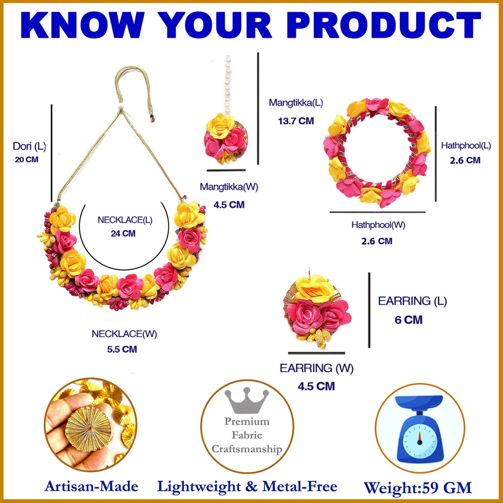 Gold-Plated Pink-Yellow Gota Patti Floral White Pearls Beaded Haldi & Mehendi Jewellery Set with Maang Tikka & Haathphool