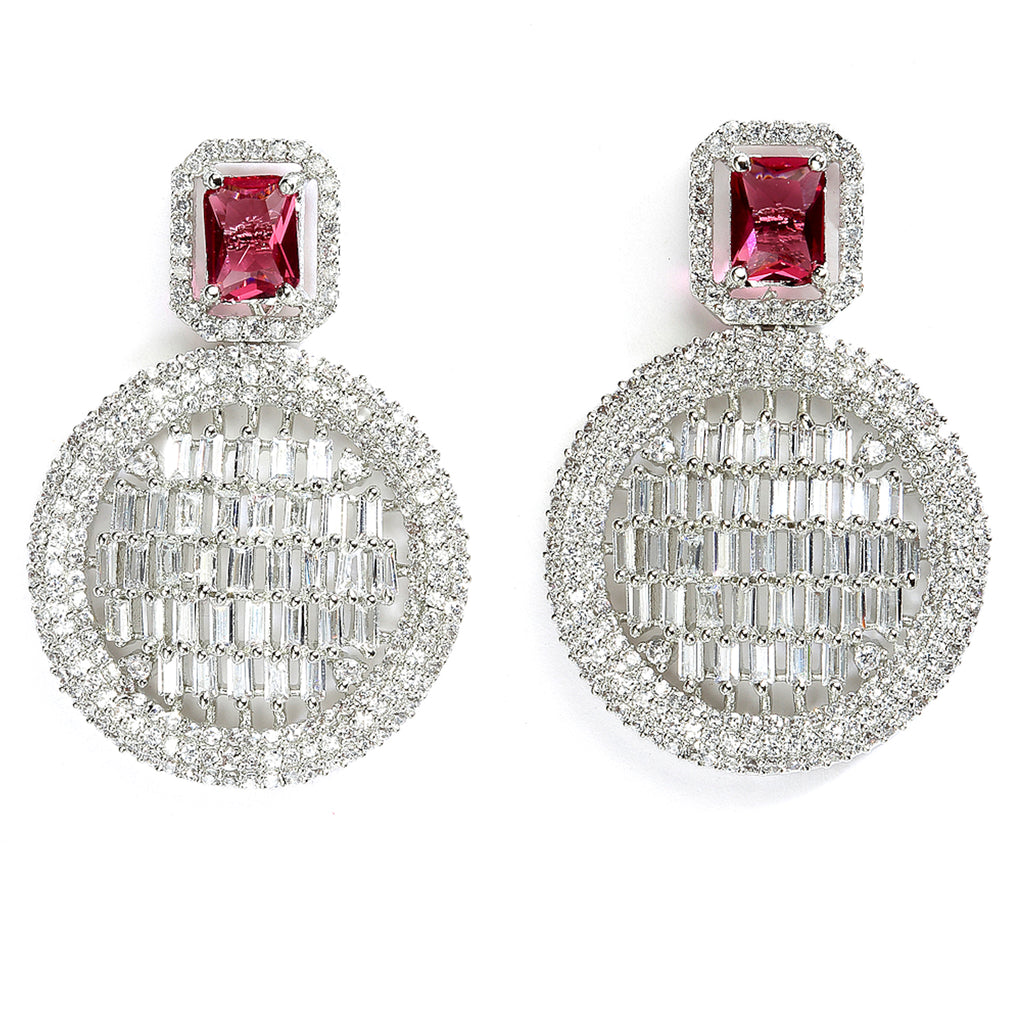 Red American Diamond Studded Geometric Shaped Rhodium-Plated with Silver-Tone Drop Earrings