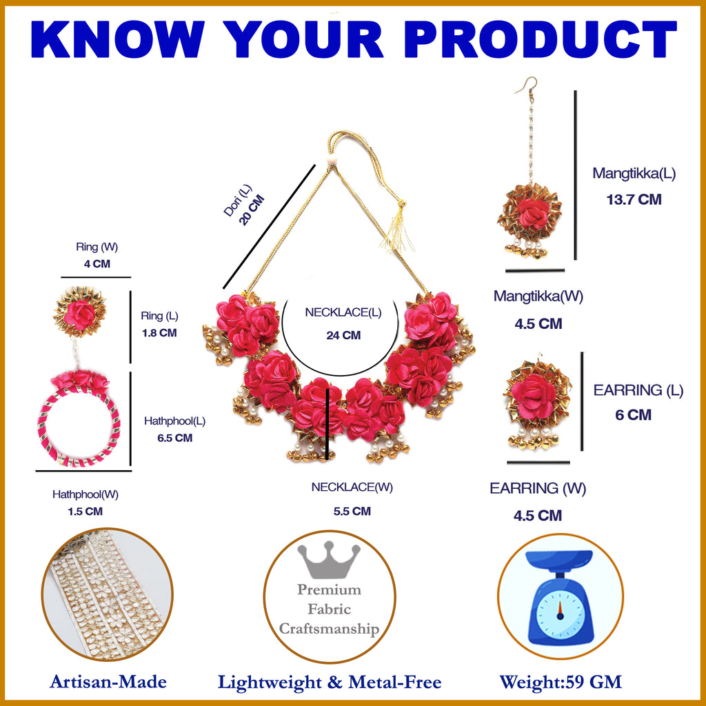 What you get:- 1 Pcs of Necklace, 1 Set of Earrings, 2 Pcs Haathphool with Ring, 1 Pcs MaangTikka