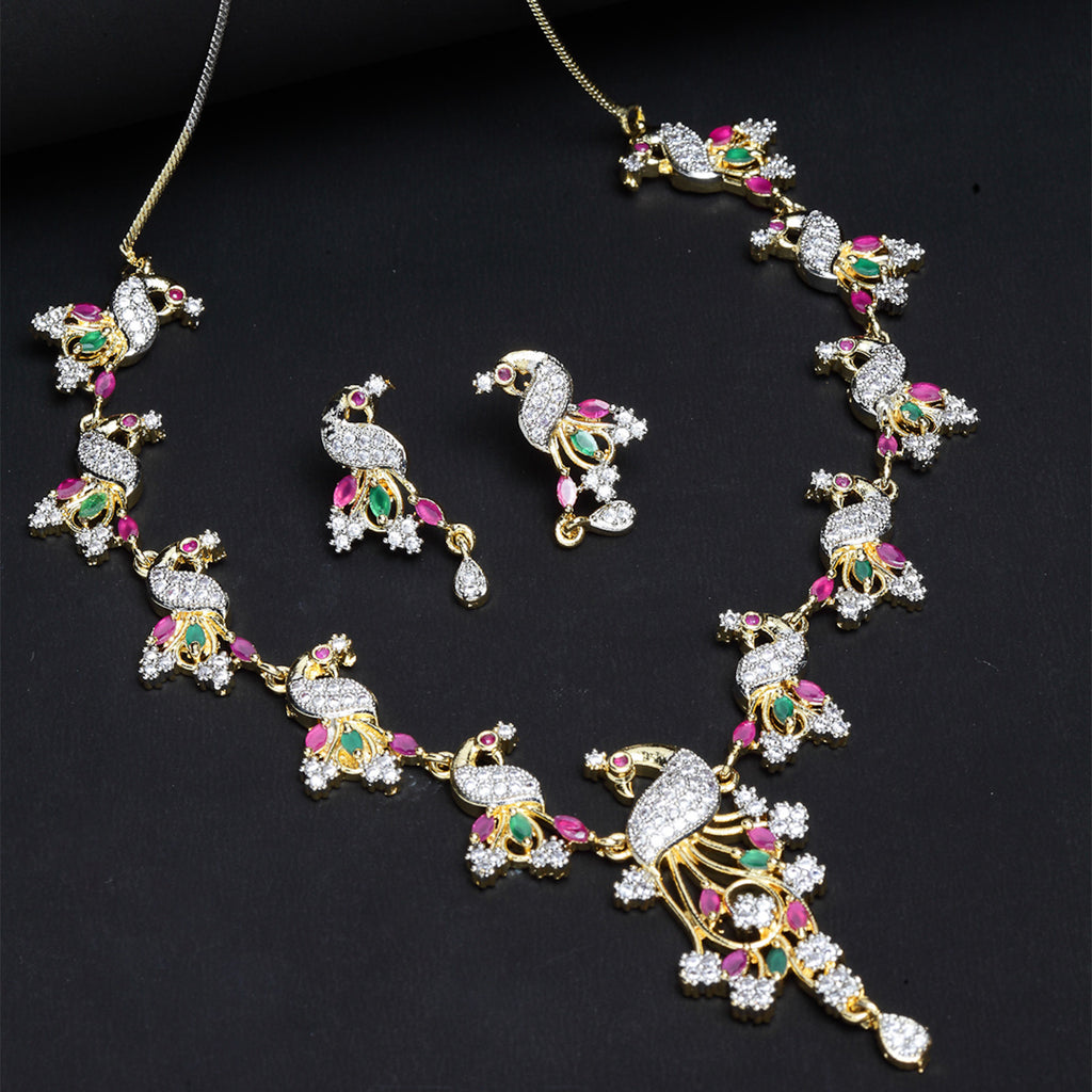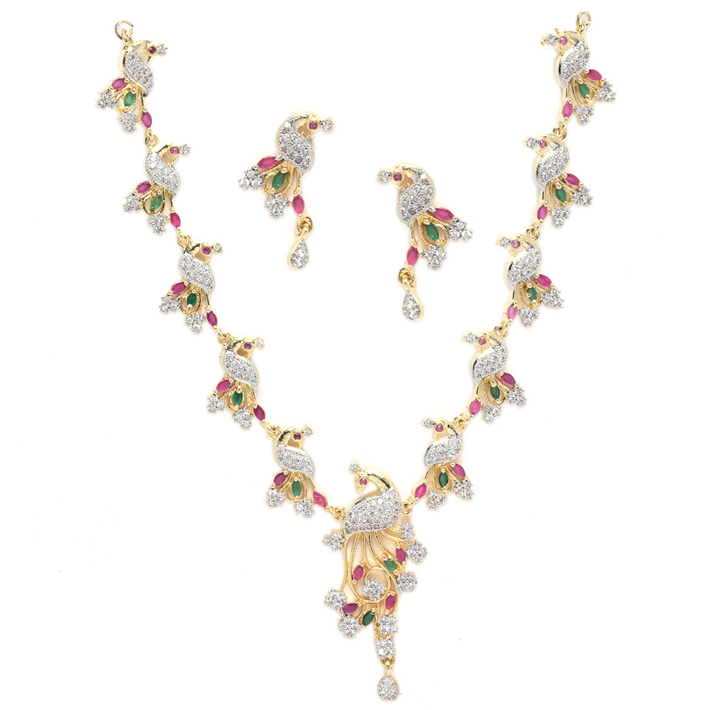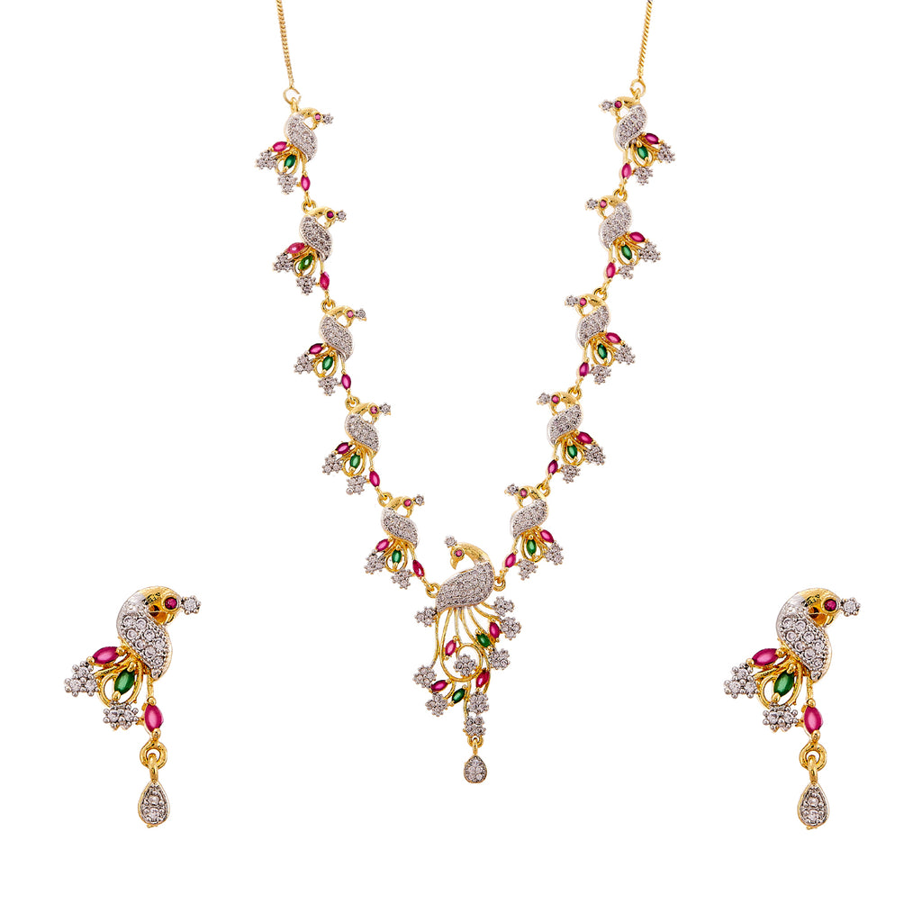 This jewellery set consists of a necklace and a pair of earrings. Gold-plated with Silver-Tone handcrafted necklace, has green and pink american diamond-studded details secured with S-hook closure. A pair of matching earrings, each secured with a post and back closure.
