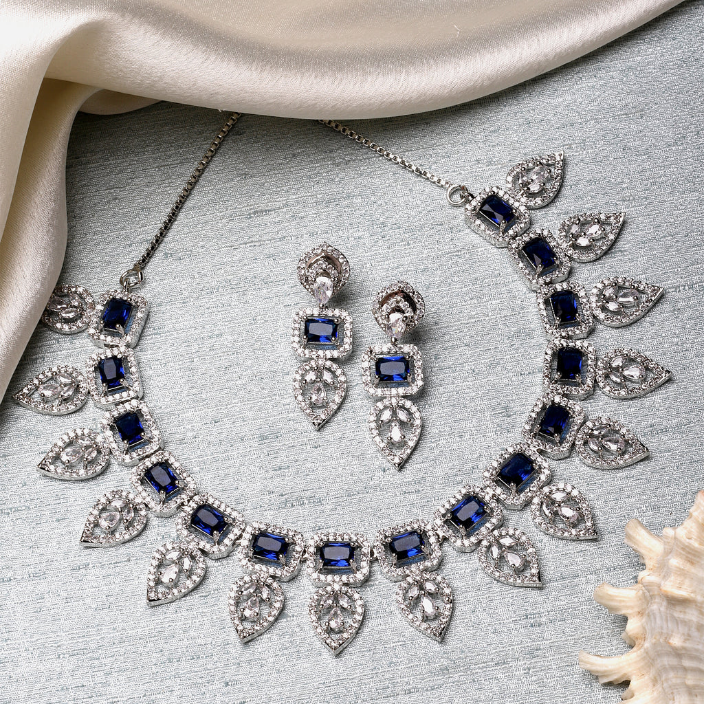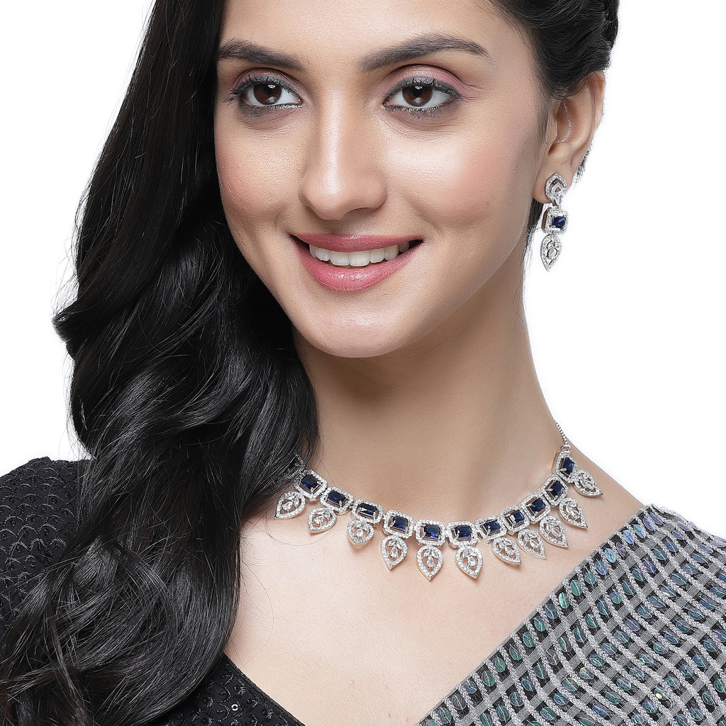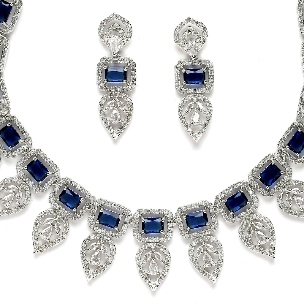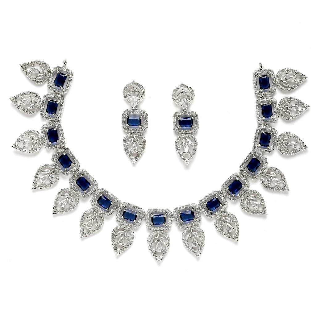 Rhodium-Plated Navy Blue American Diamond Studded Leaf Shaped Necklace with Earrings Jewellery Set