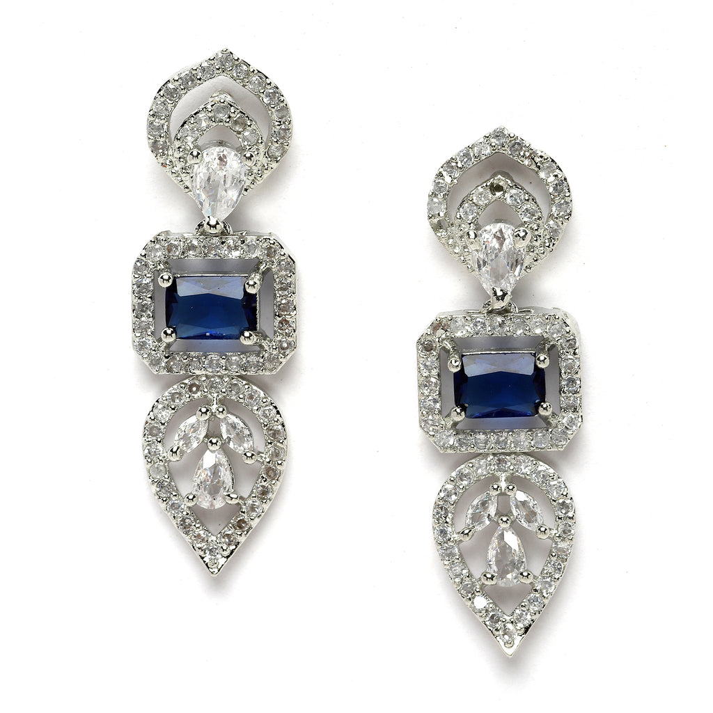This jewellery set consists of a necklace and a pair of earrings. Rhodium-Plated navy blue and white american diamond studded leaf shaped collar necklace, has secured with a hook closure. A pair of matching drop earrings, each secured with a post and back closure.