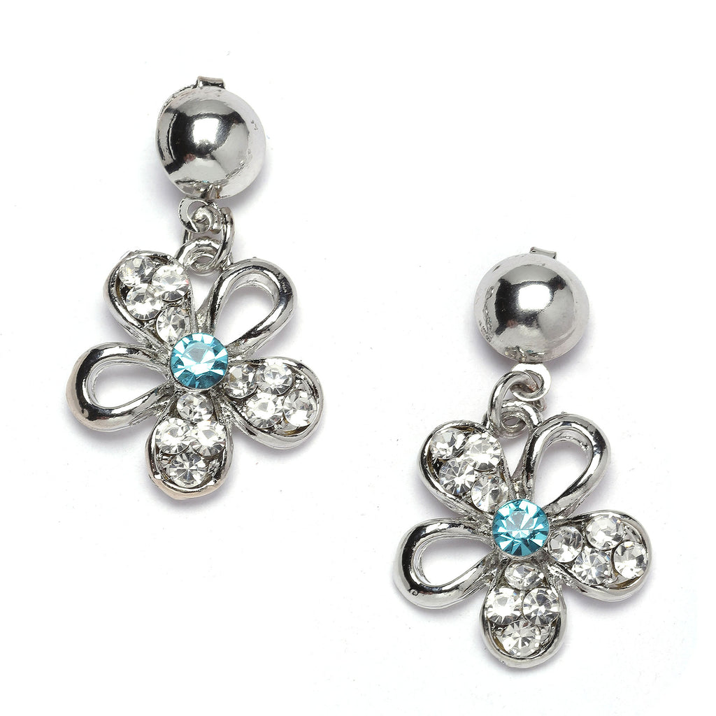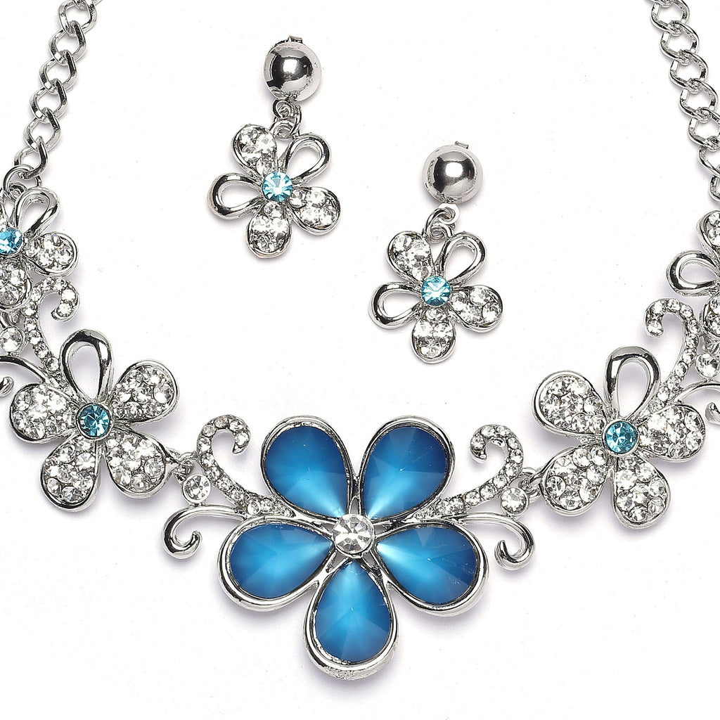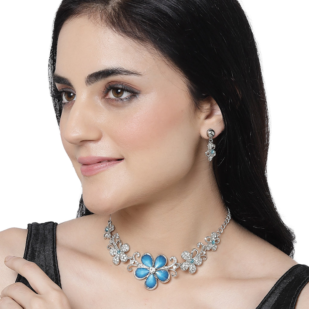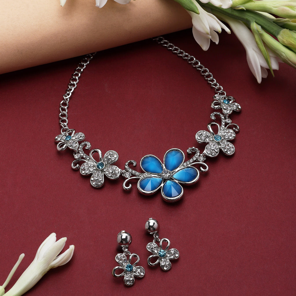 Rhodium-Plated Blue American Diamonds Studded Floweret Necklace & Earrings Jewellery Set